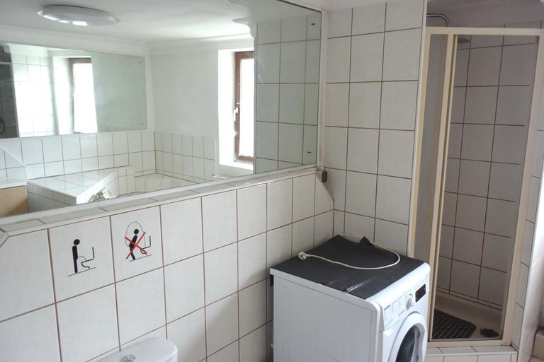 Im Vorhaus und in den Sanitärbereichen befinden sich Fliesen