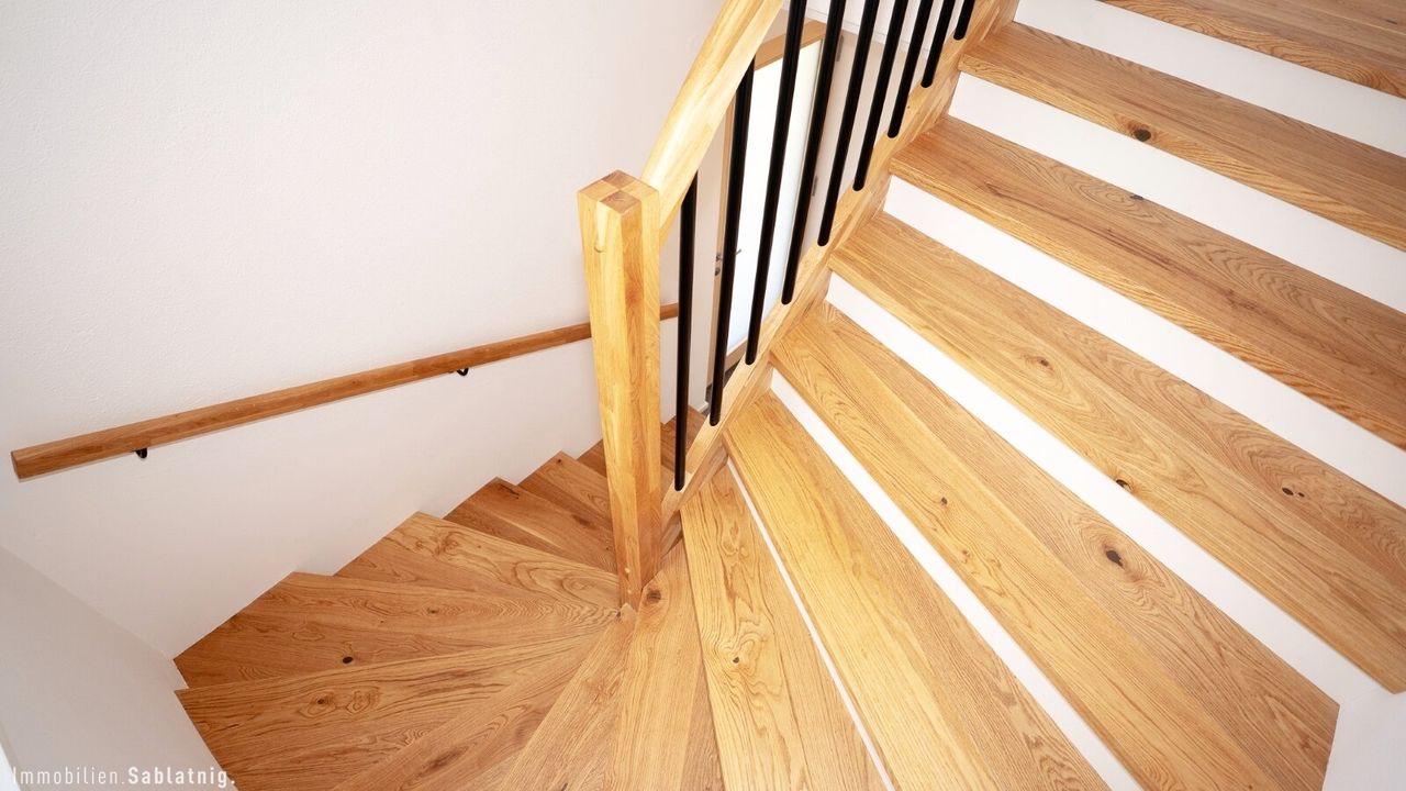 Über einen breiten, eleganten Treppenaufgang mit hochwertigen Dielenböden gelangen Sie ins Obergeschoss, das lichtdurchflutet, großzügig und einladend gestaltet ist. Hier erwarten Sie drei geräumige Schlafzimmer, eines mit direktem Zugang zum großzügigen Balkon, der viel Platz für gemütliche Sitzgelegenheiten, Pflanzen oder entspannte Sonnenstunden bietet. Ergänzt wird das Angebot durch ein weiteres helles Badezimmer mit Glasdusche und ein separates WC.