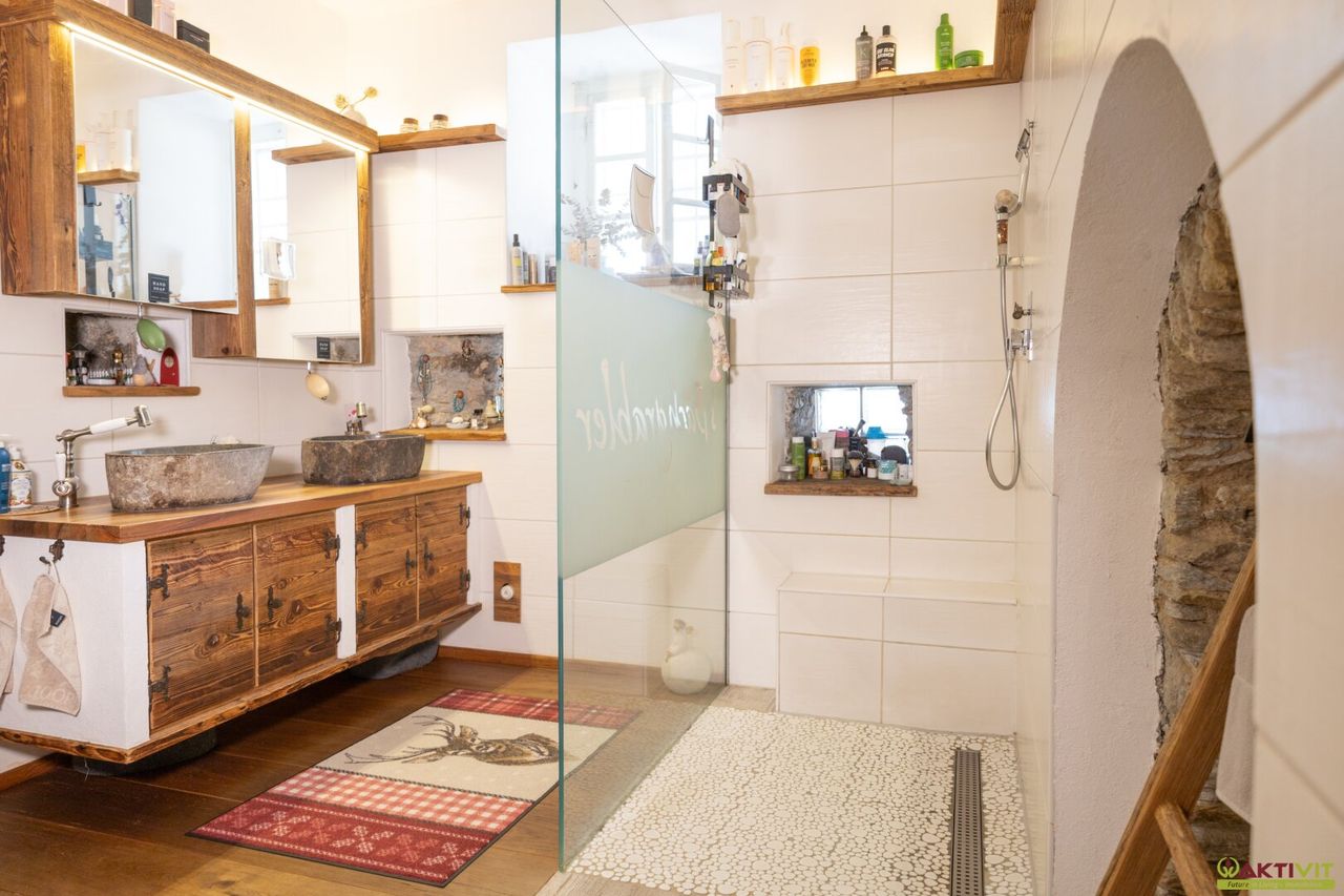 Das Herzstück bildet die voll ausgestattete Landhausküche mit Gasherd, Holzofen, Vorratskammer und Essbereich. Ein großzügiges Bad mit Regenwalddusche, zwei Waschbecken und stilvollen Holzelementen schafft ein besonderes Ambiente.
