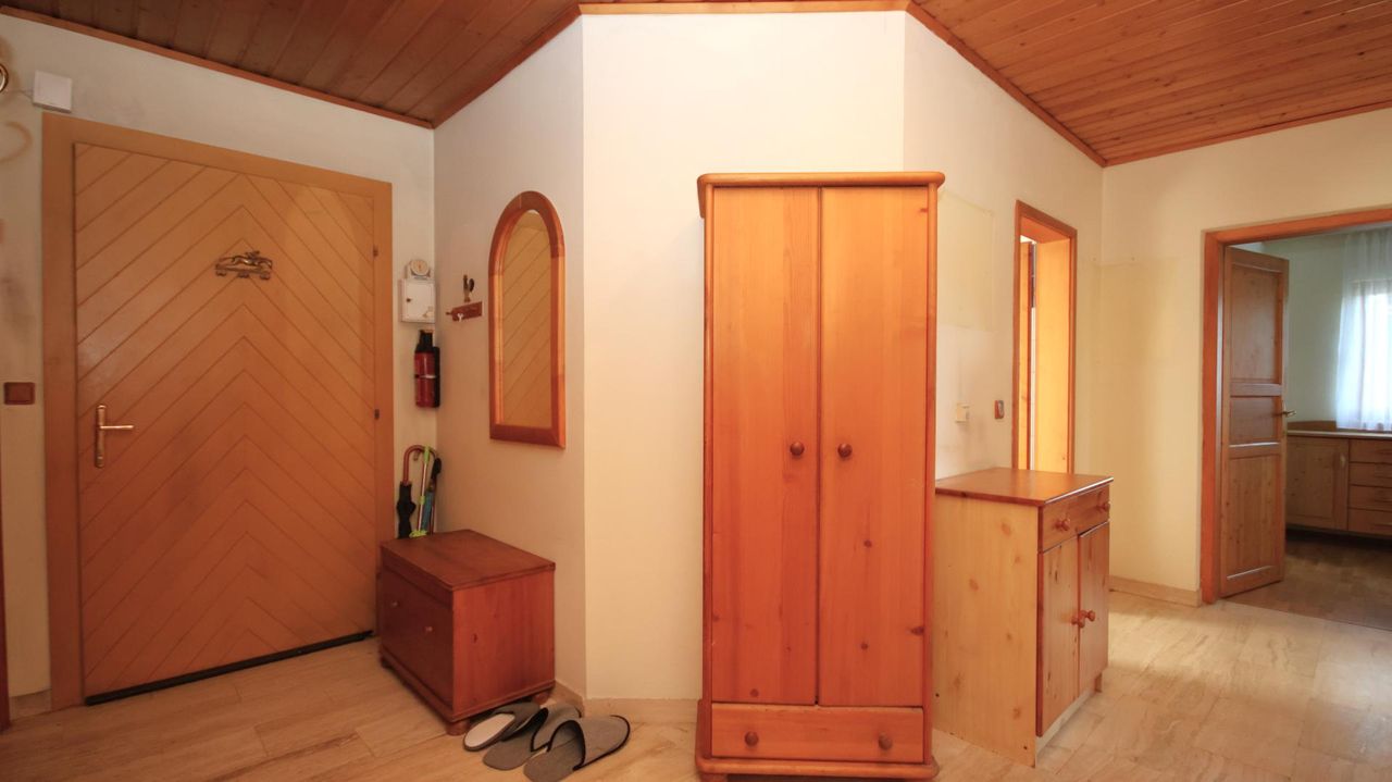 Im Erdgeschoss, in robuster Blockbauweise errichtet, finden Sie einen einladenden Vorraum, eine separate Küche mit Küchenzeile, ein Badezimmer mit WC, ein Schlafzimmer mit angeschlossenem Schrankraum sowie einen großzügigen Wohnraum – perfekt für gemütliche Gemeinschaftszeiten und flexible Raumaufteilung.