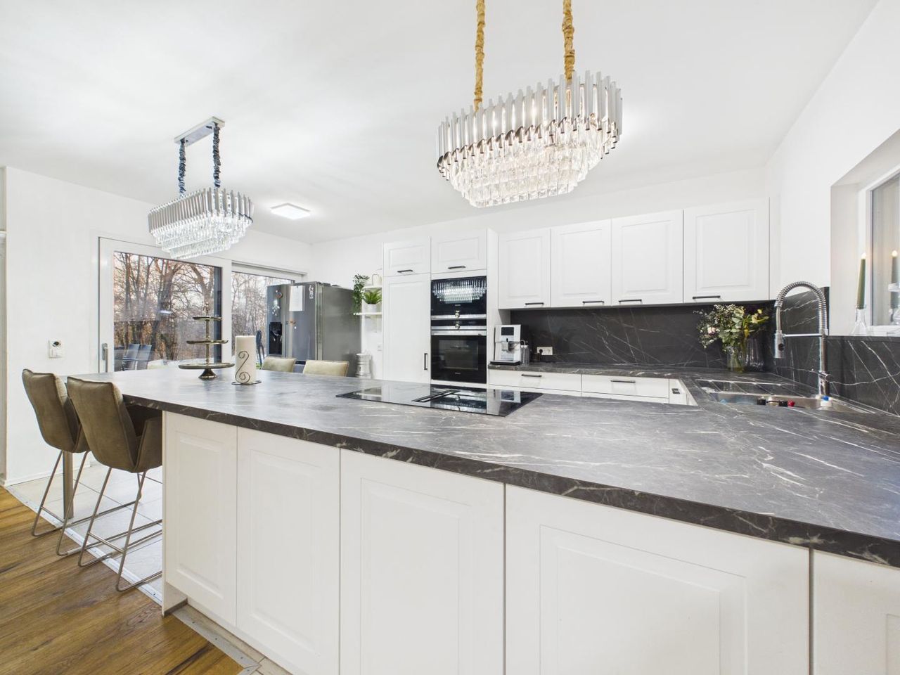 Das absolute Herzstück ist jedoch der großzügige Wohn- und Essbereich mit offener Küche. Die hochwertige Einbauküche fügt sich harmonisch in den Raum ein und schafft gemeinsam mit der offenen Gestaltung ein modernes Wohngefühl.