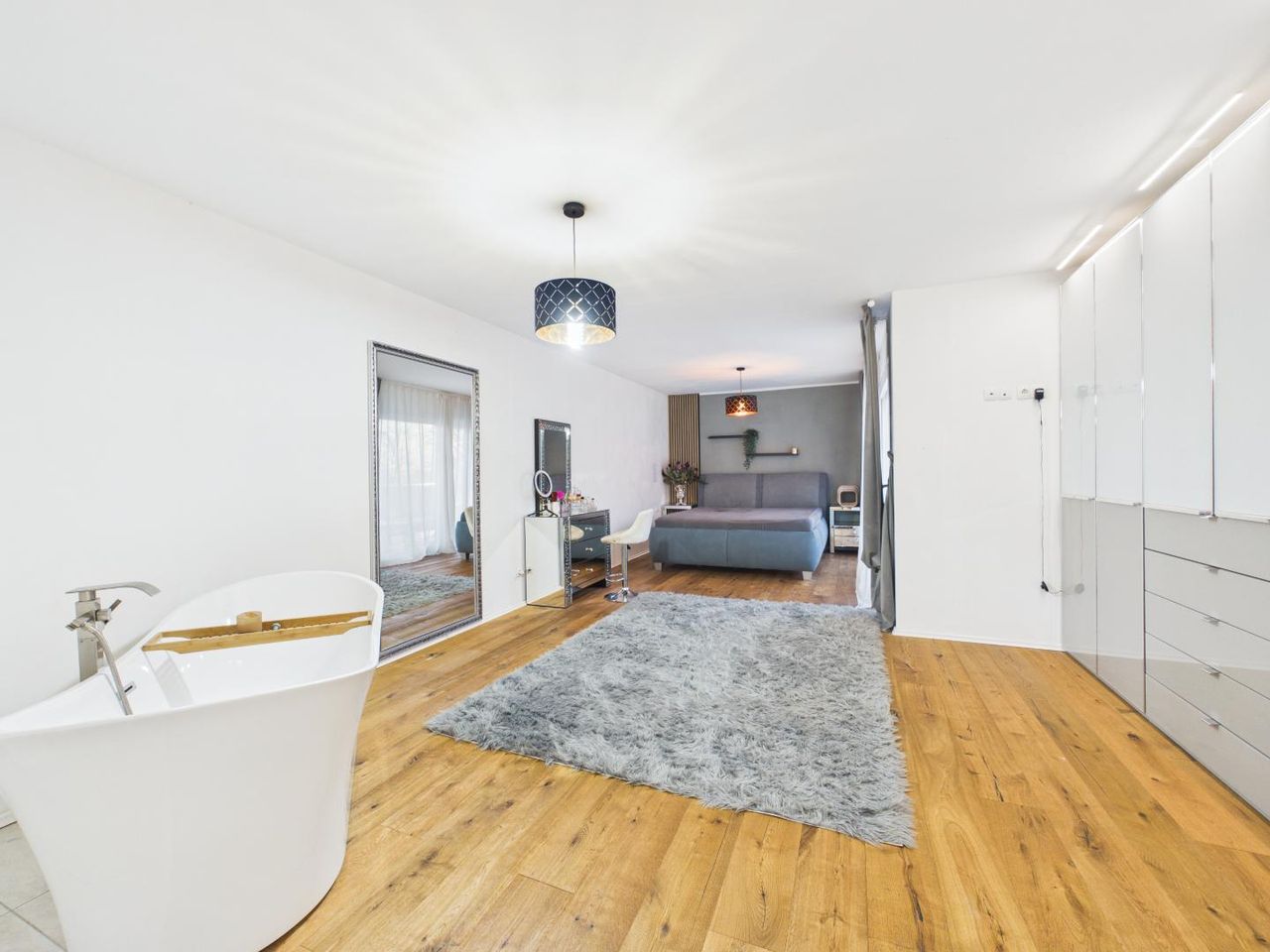 Neben der großzügigen Raumfläche verfügt das Schlafzimmer über eine freistehende Badewanne direkt im Raum sowie über einen direkten Zugang zum Balkon – ein privater Rückzugsort mit besonderem Flair.