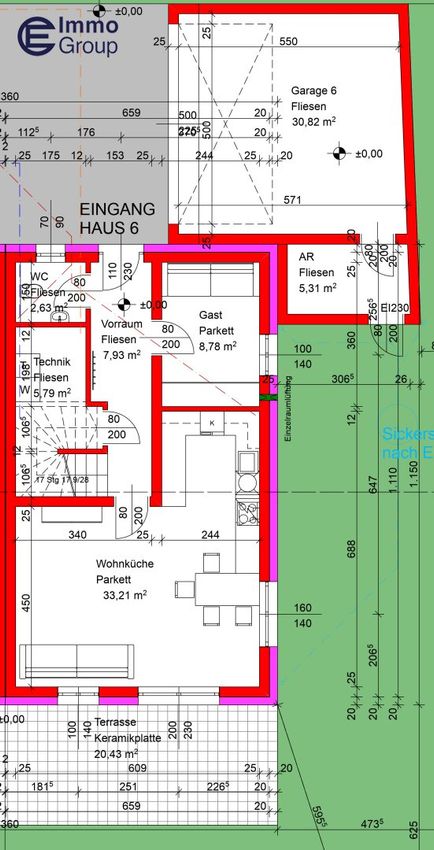 - Mindestens 1 Garage (21–37 m²), teilweise als Doppelgarage