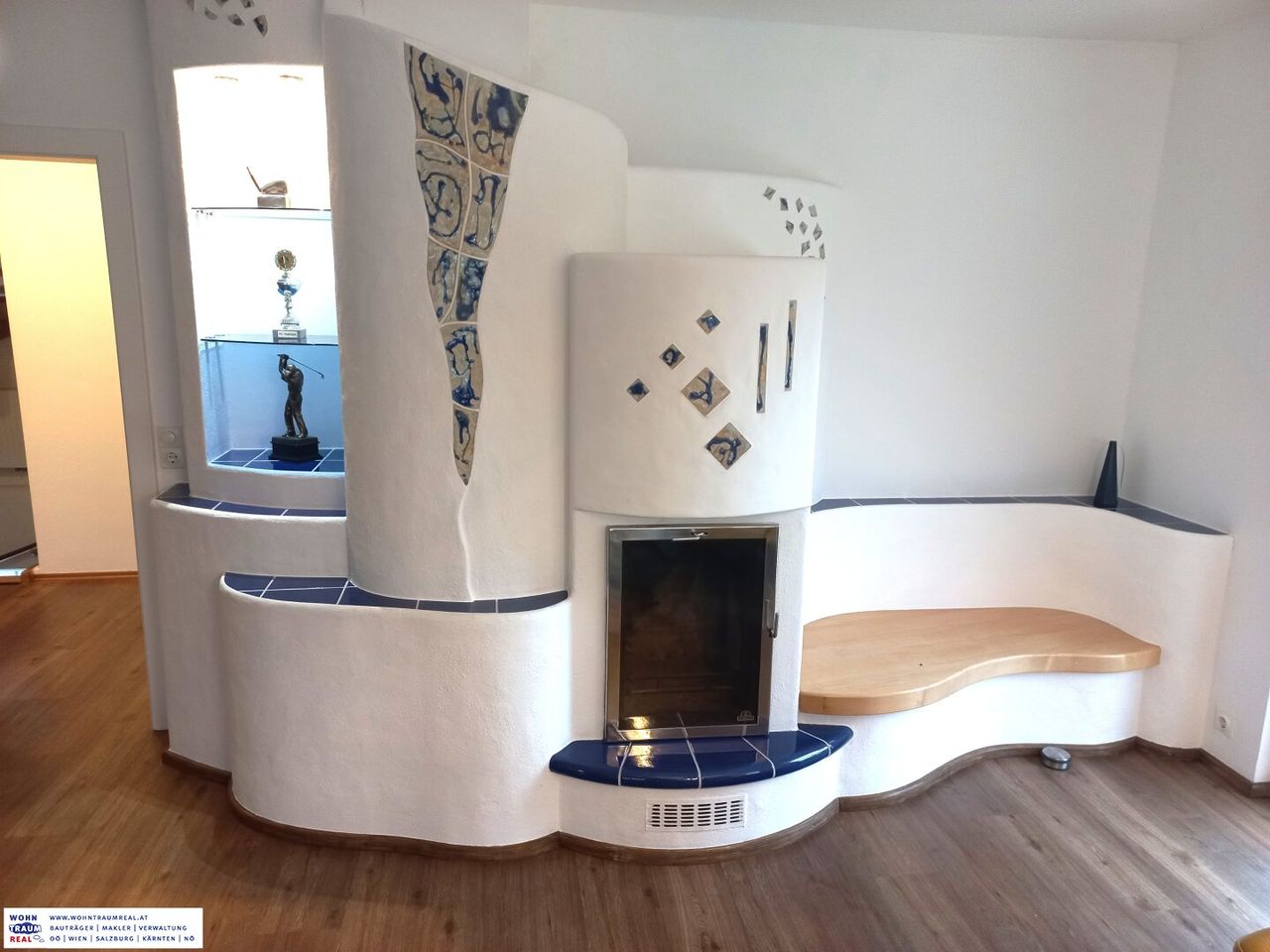 Ein stilvoller Kachelofen sorgt zusätzlich für behagliche Atmosphäre und effiziente Wärme an kühleren Tagen.