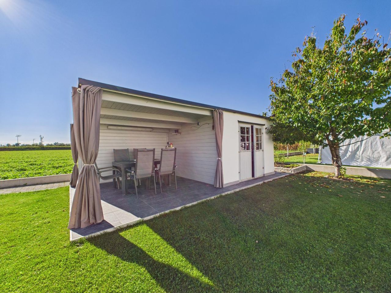 Der Außenbereich ist ein echtes Highlight dieser Immobilie: Südwestlich ausgerichtet, grenzt der Garten direkt an weitläufige Felder – unverbaut und ruhig. Die großzügige Terrasse, eine charmante Gartenhütte und der gepflegte Rasen bieten viel Platz für Erholung, Familie und Freizeit.