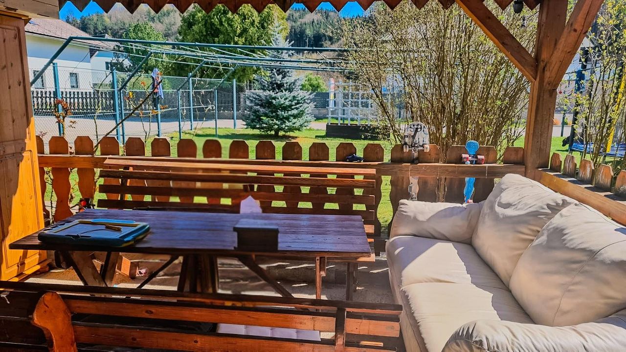 Ergänzt wird das Ganze durch eine großzügige Gartenhütte mit überdachtem Loggiabereich, die sich ideal für gesellige Abende, Feiern oder entspannte Stunden im Freien eignet.