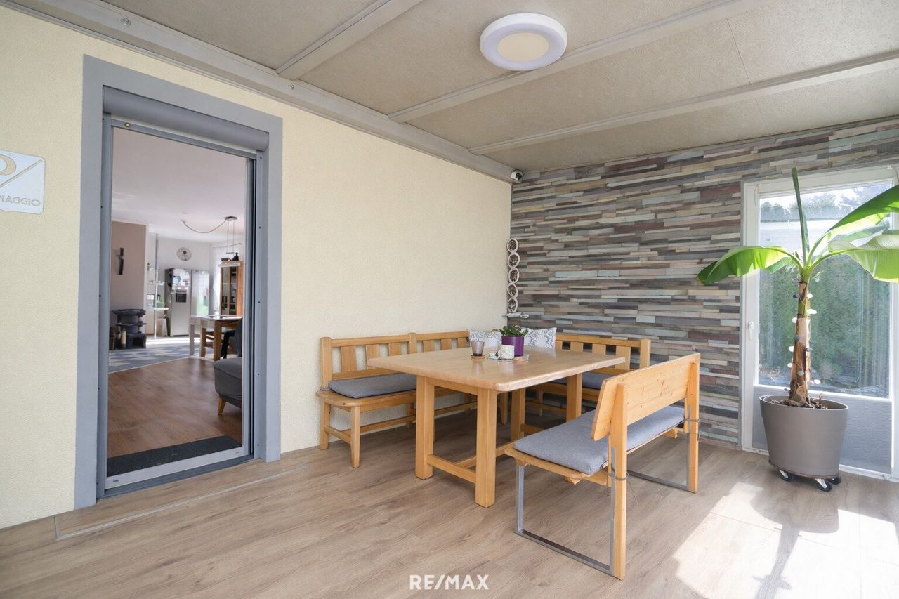 Der zentrale Lebensmittelpunkt des Hauses: Ein großzügiger Wohn-, Ess- und Küchenbereich mit gemütlichem Kamin bildet das Herzstück und geht fließend in den lichtdurchflutete Wintergarten, der den Wohnbereich erweitert und zu jeder Jahreszeit einen angenehmen Rückzugsort bietet, über. Ergänzt wird diese Ebene durch einen einladenden Vorraum, eine praktische Speis, ein WC, das Stiegenhaus sowie ein weiteres Zimmer, das sich ideal als Büro oder Gästezimmer nutzen lässt.