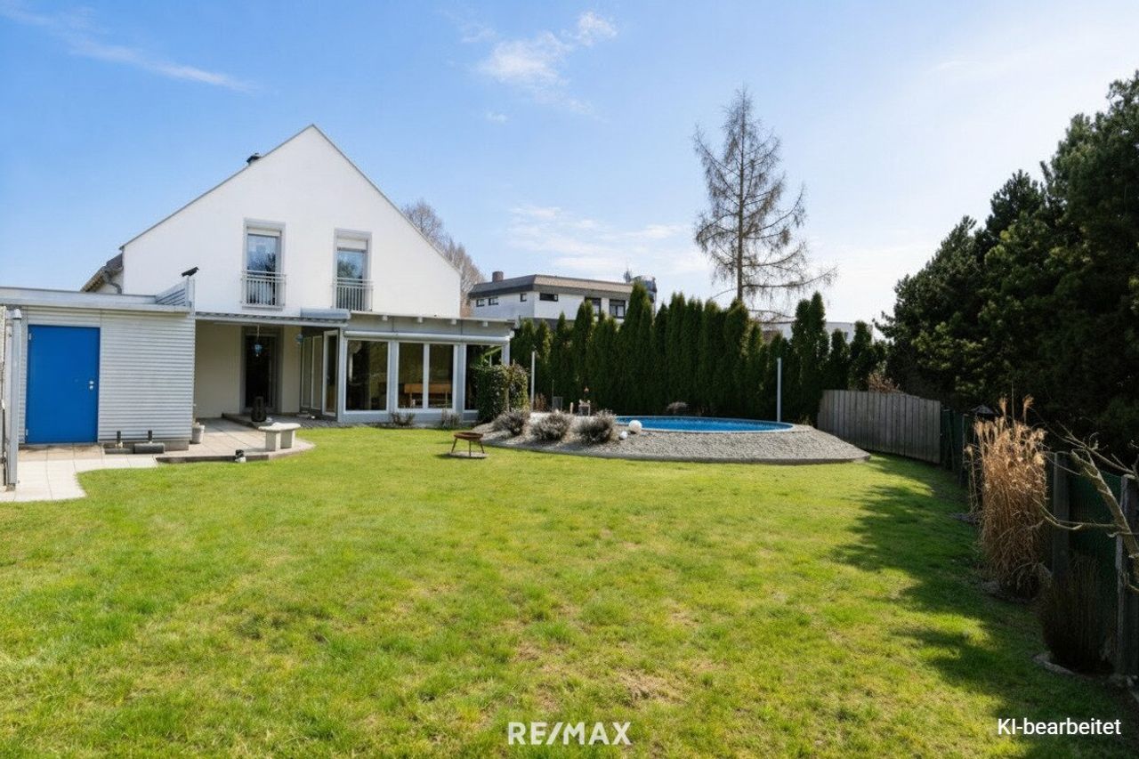Der Außenbereich präsentiert sich ebenso durchdacht wie das Haus selbst: Ein ansprechend gestalteter Garten lädt zum Verweilen ein und bietet ausreichend Platz für Erholung und Aktivitäten im Freien. Highlight ist der runde Pool, der an warmen Tagen für Abkühlung sorgt und den Garten zu einer privaten Wohlfühloase macht. Durch die unverbaubare Südwestausrichtung sind raumhafte Sonnenuntergänge auf ewig garantiert.