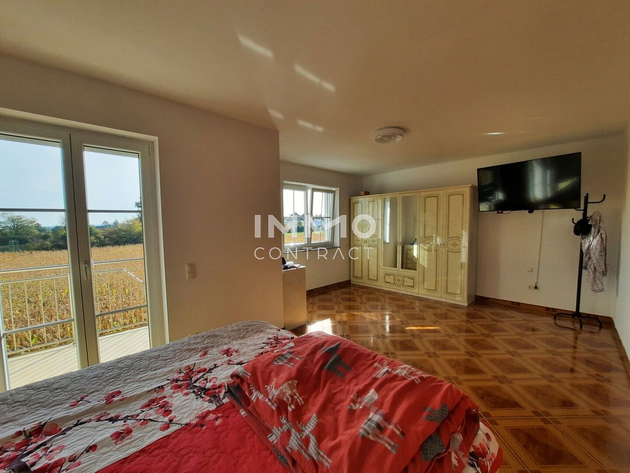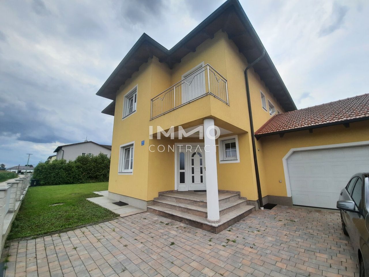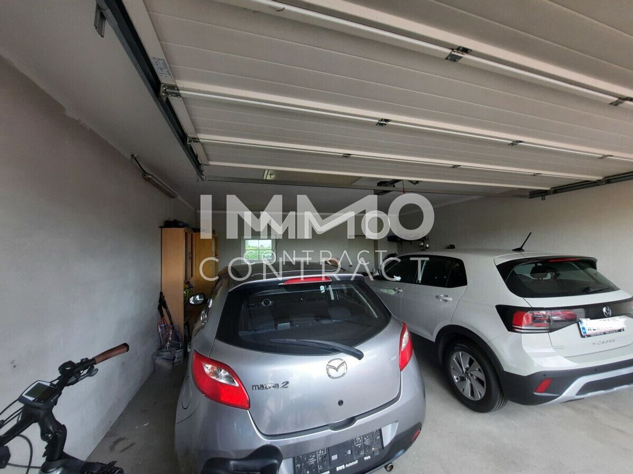 Zusätzlich zum Innenraum bietet das Haus eine Doppelgarage, eine Terrasse und einen Balkon.