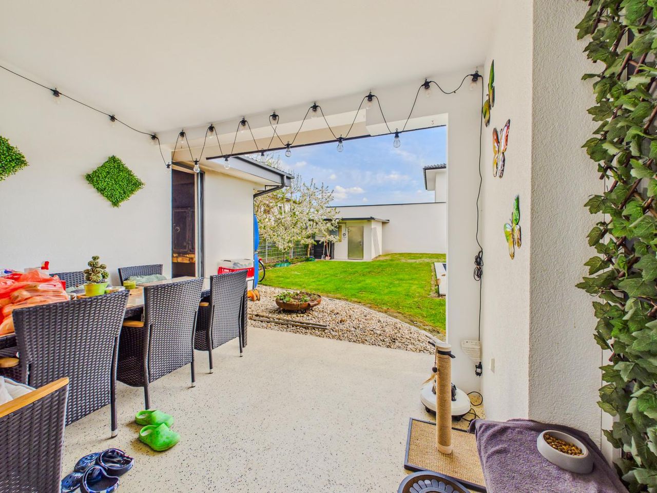 - eine voll überdachte Terrasse mit direktem Zugang in den Garten