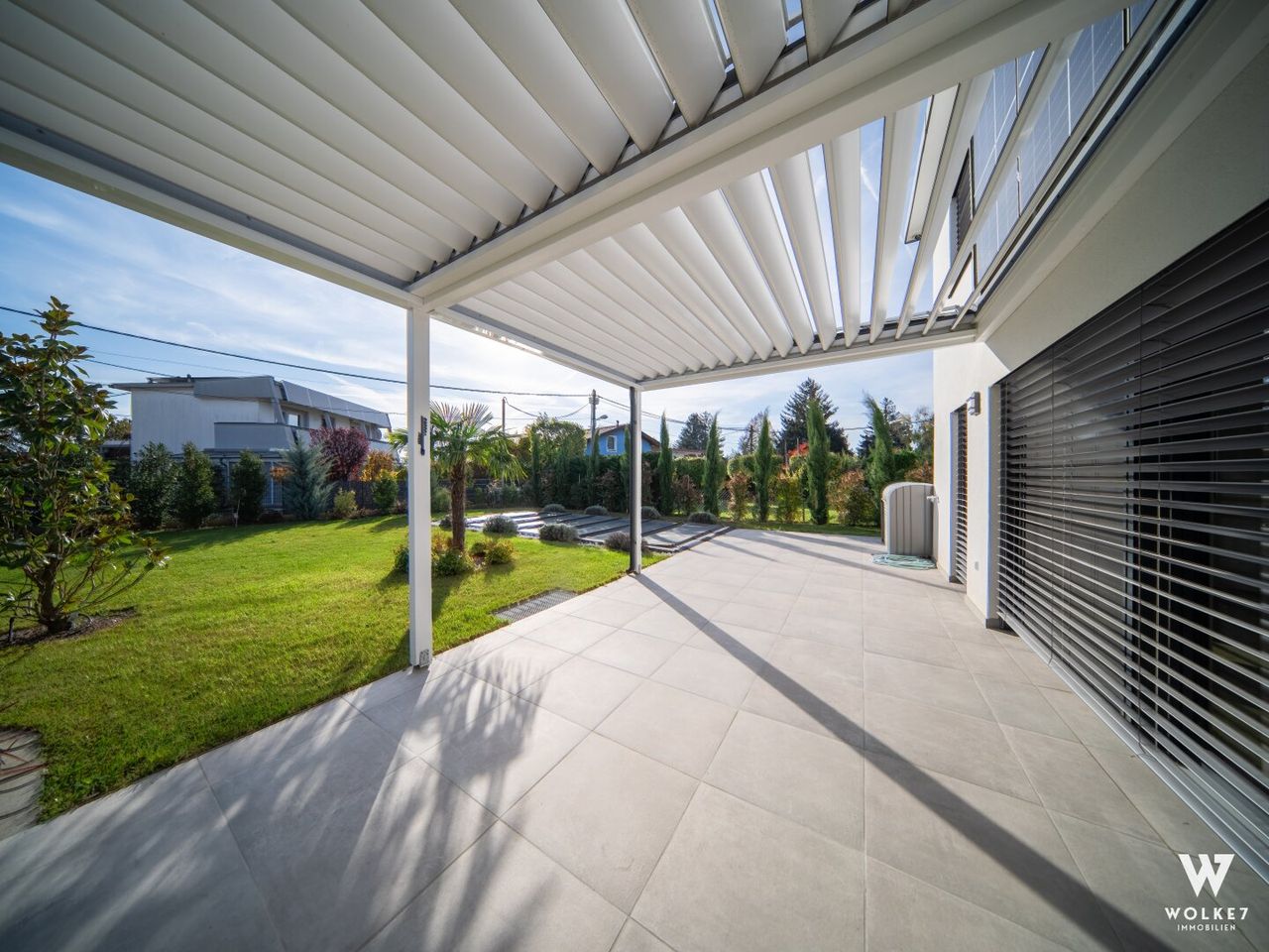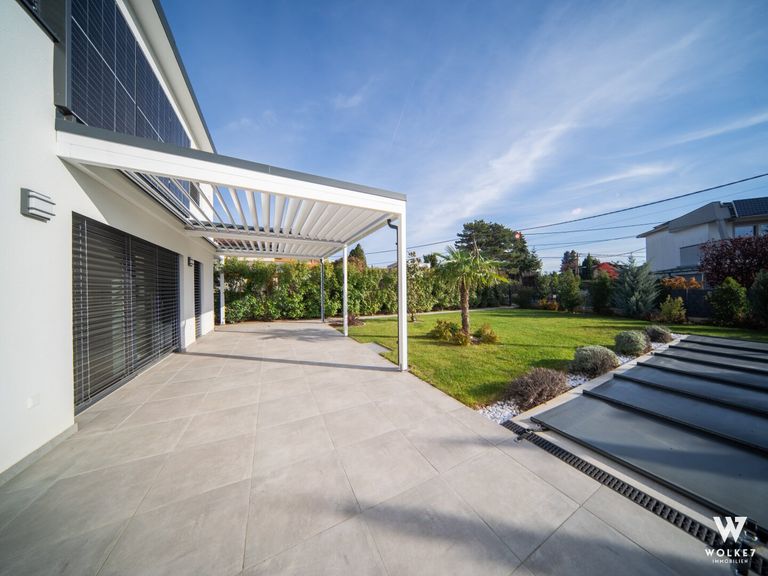 - Terrasse mit Wohlfühlatmosphäre: Perfekt für entspannte Abende mit Freunden und Familie – die großzügige Terrasse mit toller Pergola und Lammellenüberdachung lädt zu gemütlichen Stunden im Freien ein.