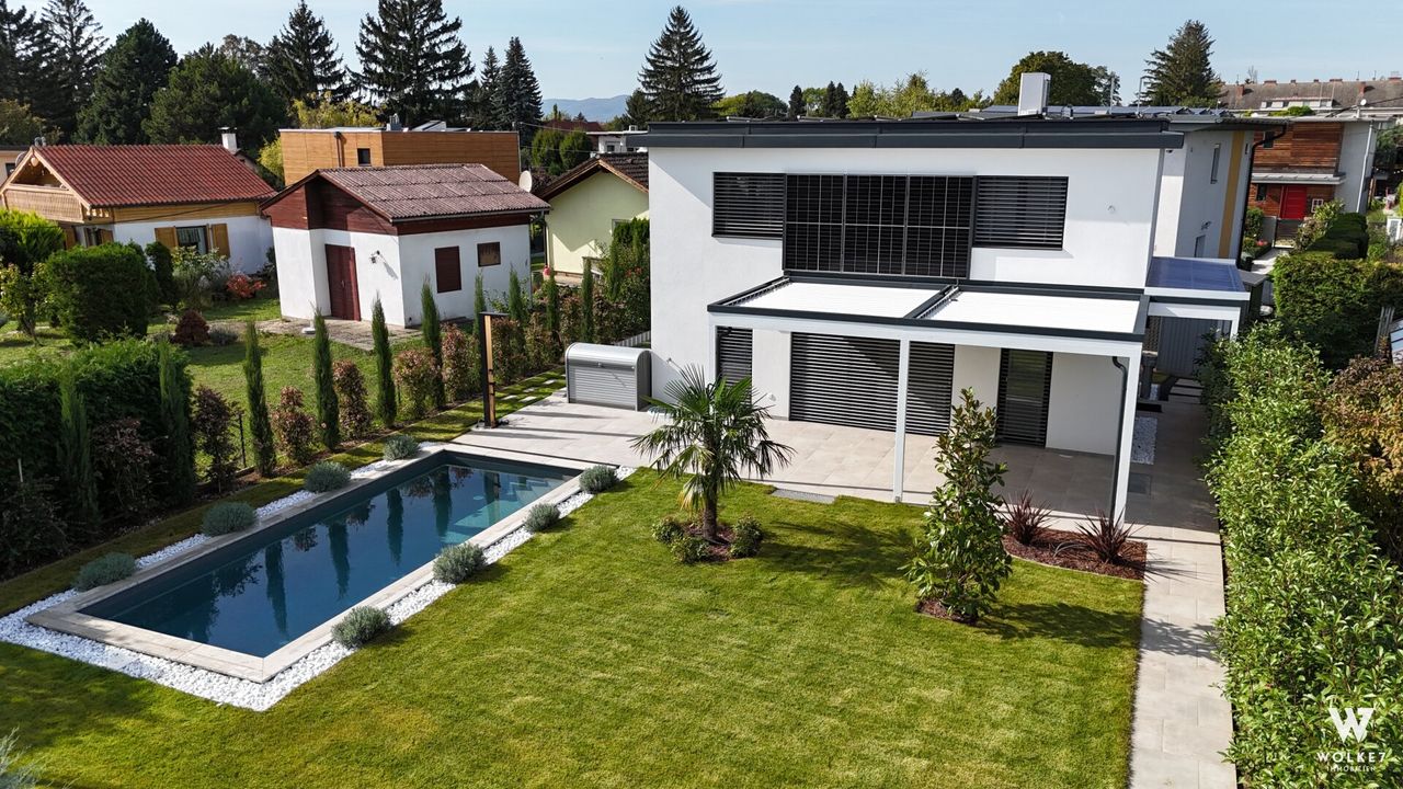 ERSTBEZUG: Hochwertig ausgestattetes Einfamilienhaus auf Eigengrund mit Pool | PV+Speicher | Deckenkühlung | Gartenbewässerung | Luftwärmepumpe | Wohnraumbelüftung: Hier geht es zum Video: https://youtu.be/Kuc1v6h9CBA Willkommen in Ihrem neuen Traumhaus! Dieses außergewöhnliche Einfamilienhaus bietet Ihnen modernsten Wohnkomfort auf höchstem Niveau – von erstklassiger Ausstattung über intelligente Haustechnik bis hin zu einem perfekt angelegten Garten. Hier bleibt kein Wunsch offen.
