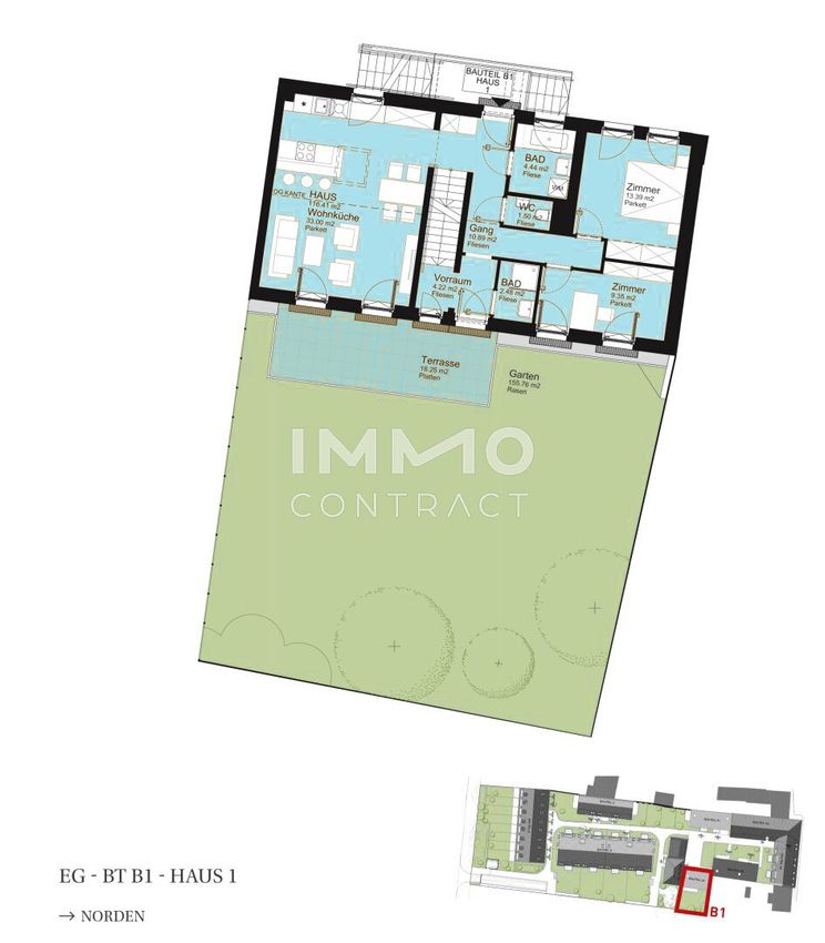 - Private Freiflächen bei allen Einheiten: Gärten, Terrassen, Balkone oder Loggien