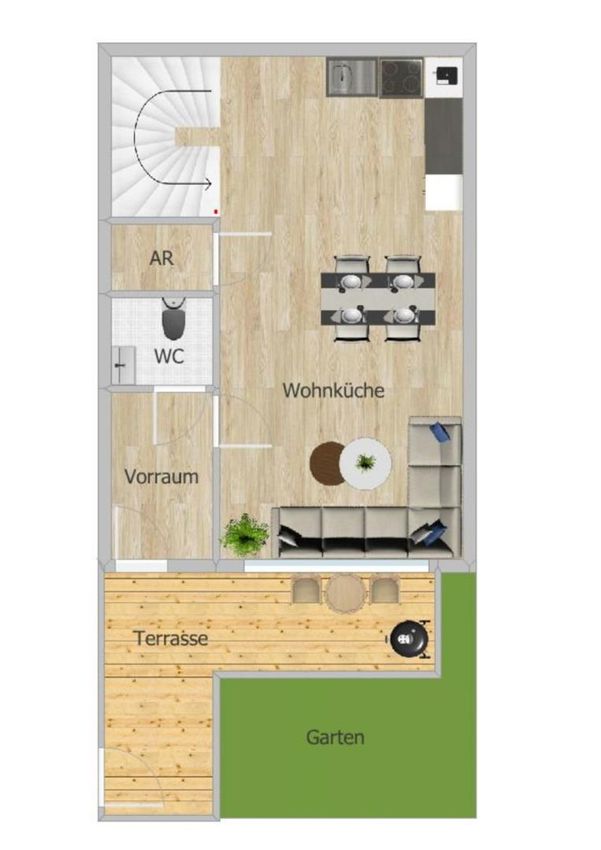 - Bodenbeläge: Feinsteinzeug in den Nassräumen, Parkettböden in den Wohnräumen, Holzbelag auf der Terrasse
