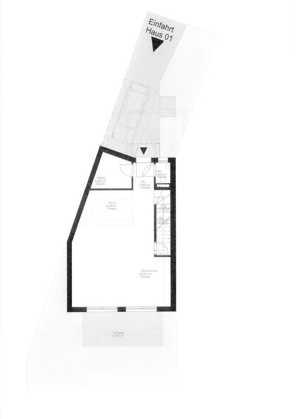 Aufteilung – Zugang nordseitig über den Parkplatz/mit elektrischem Tor, Eingangsbereich mit Garderobe, Technikraum und 1. WC.