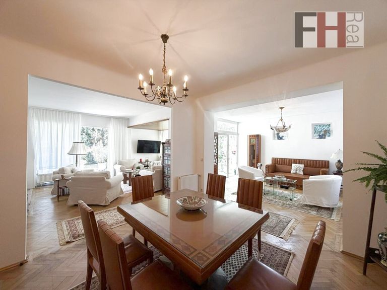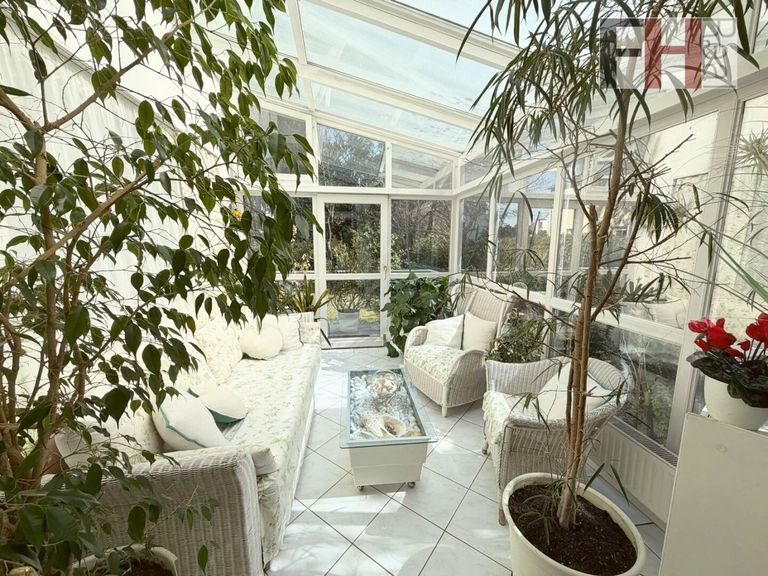 Das Erdgeschoss bietet als Highlight den beeindruckenden, mehr als 41m² großen Wohnsalon mit offenem Kamin und Ausgang auf die Terrasse und in den Garten. Vom Wohnsalon aus erreichen Sie ein weiteres, ca. 18m² großes Zimmer mit Zugang zum voll verglasten Wintergarten, eine Grün- und Ruheoase mit schönem Blick in den Garten. Auf dieser Ebene befinden sich noch die Küche, ein Abstellraum, eine Toilette und den Vorraum mit Zugang zum Obergeschoss.