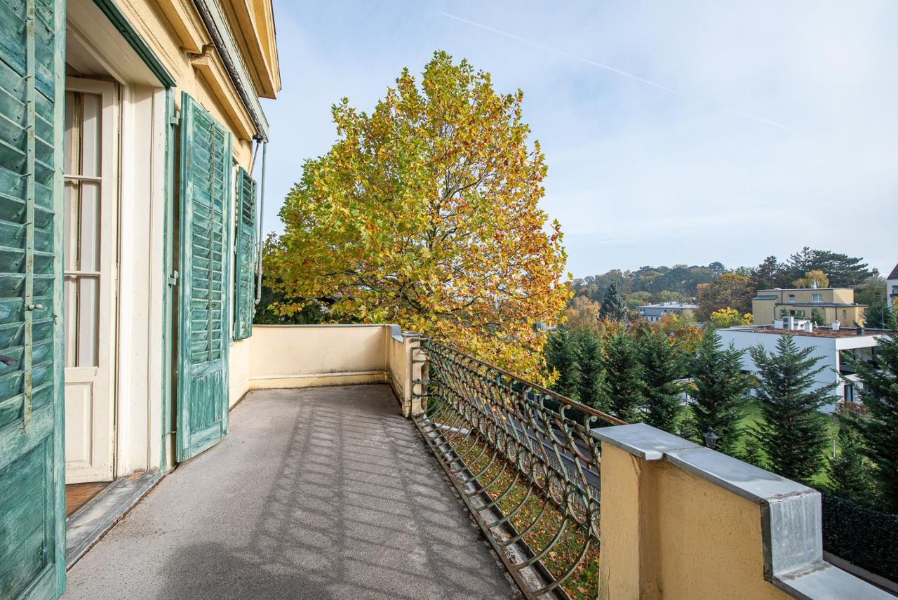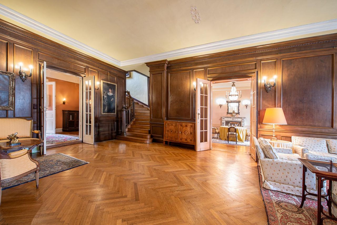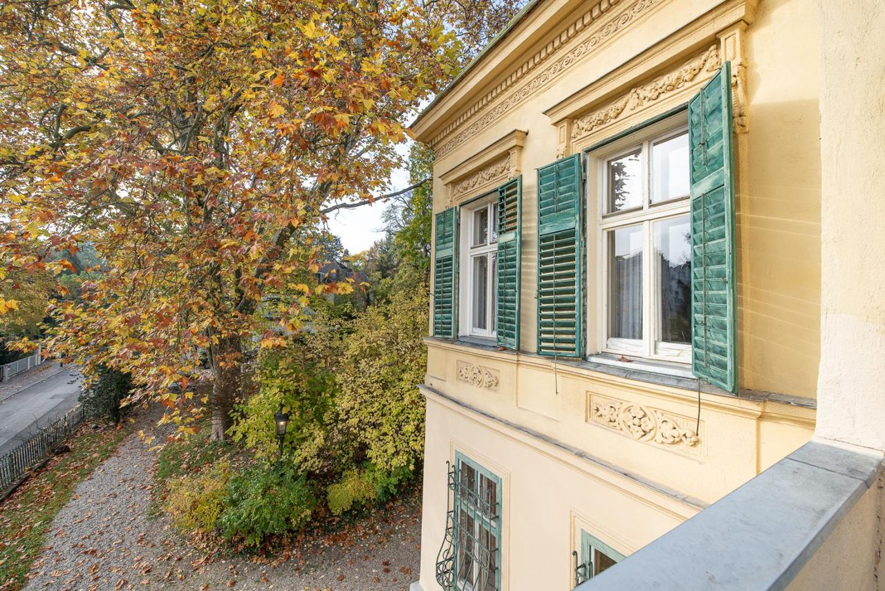 Die Hauptvilla überzeugt durch eine elegante, großzügige Raumaufteilung und ihr authentisches historisches Flair. Edle, vertäfelte Salons, ein stilvolles Speisezimmer, Marmorkamine, hochwertige Parkettböden sowie doppelflügelige Kassettentüren verleihen dem Interieur eine zeitlose Noblesse. Ein repräsentatives, großzügig dimensioniertes Stiegenhaus führt in die oberen Etagen und unterstreicht den herrschaftlichen Charakter des Hauses.