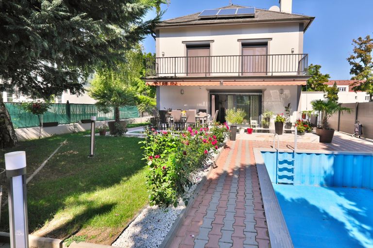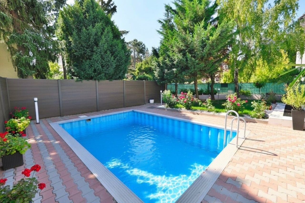 Attraktive Stadtvilla mit 6 Haupträumen, Garten, Vorgärten, Swimmingpool, Balkon, KFZ-Plätzen, ganzjährige Solarwarmwasserversorgung, Partyraum im Wohnkeller, offener Kamin.