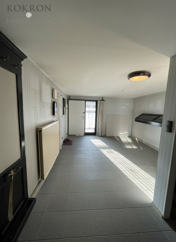 Sie betreten im Untergeschoss die geräumige Eingangshalle mit Treppenaufgang, einem Lagerraum unter der Treppe und einem großen Lagerraum mit der Gasetagenheizung.
