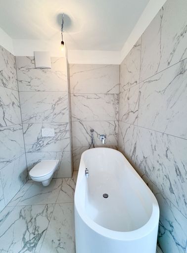 - ein geräumiges Badezimmer mit Badewanne und Toilette