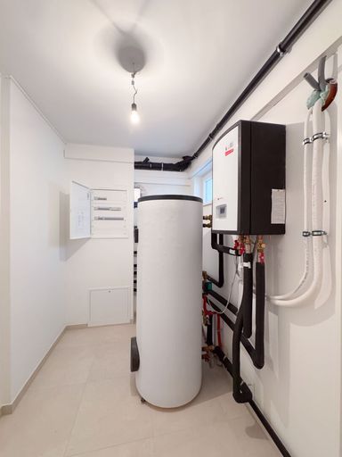 Die Beheizung und Kühlung erfolgt über eine Fußbodenheizung bzw. Fussbodenkühlung mit einer effizienten Luftwärmepumpe. Ein 375 Liter Warmwasserspeicher ist installiert.