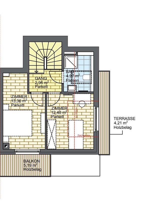 - ein 13,36 m2 großes Schlafzimmer mit Zugang zur 5,19 m2 Balkon
