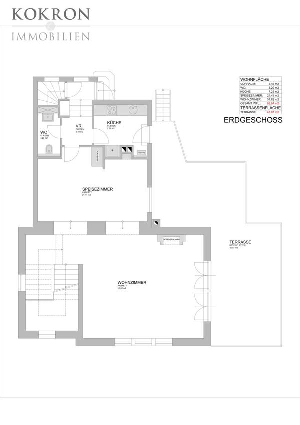 Die Wohnebene und das Dachgeschoß umfassen 123 m² Wohnfläche sowie eine Terrasse mit 45 m² plus eine Dachterrasse mit ca. 40 m². Hier finden Sie das großzügige Wohnzimmer mit offenem Kamin und Ausgang auf die große Gartenterrasse. Weiters ein Esszimmer, Küche, WC und Vorraum. Im Wohnsalon führt eine geschwungene Holzstiege in das Dachgeschoss - hier finden Sie ein Arbeitszimmer sowie ein Bad und den Ausgang auf die große Dachterrasse mit herrlichem Fernblick.