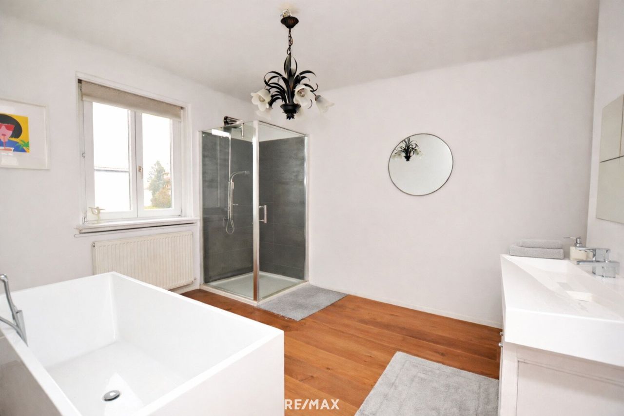 • großes Badezimmer mit Badewanne, Regendusche und Doppelwaschbecken