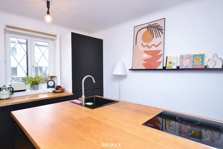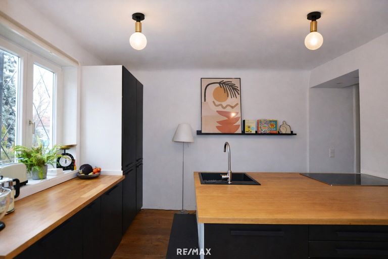 Der offene Wohn- und Essbereich überzeugt mit viel Tageslicht, Vollholzdielen sowie einem Kaminofen mit Backrohr und Kochfläche – ein besonderes Detail mit praktischem Mehrwert. Die moderne Einbauküche ist hochwertig ausgestattet und fügt sich harmonisch in das Wohnkonzept ein.