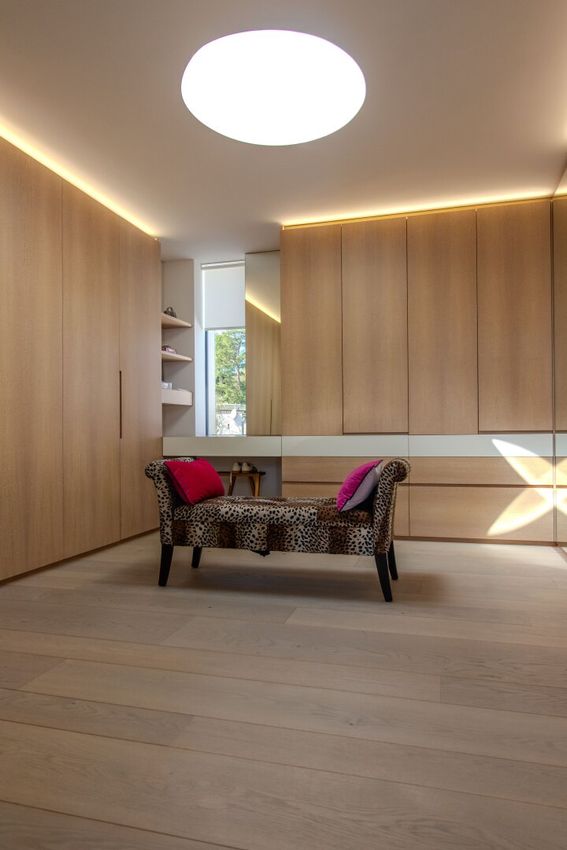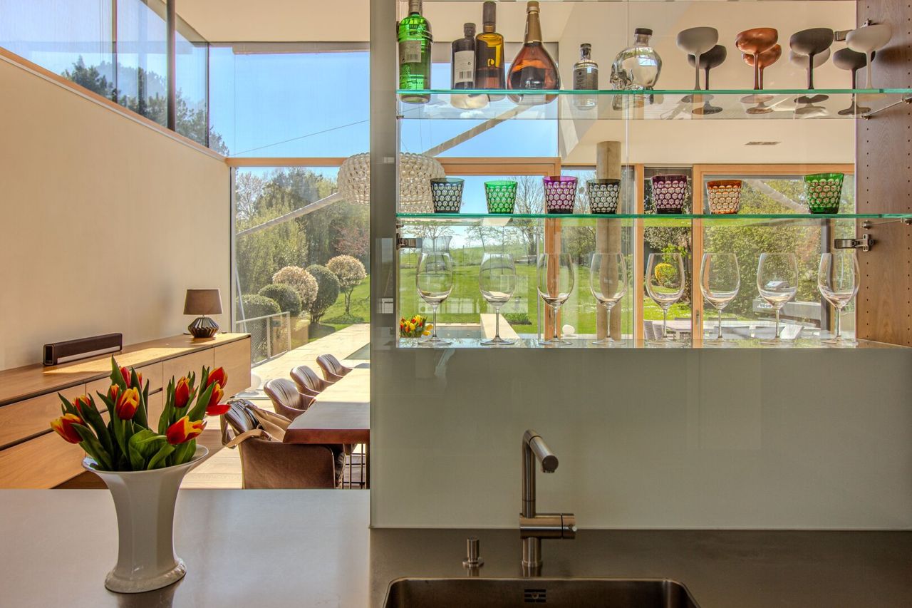 Die Holzböden aus geräucherter Eiche ziehen sich durch das gesamte Haus und finden sich in den maßgefertigten Möbeln wieder. Die vom Tischler handgefertigte Küche ist mit hochwertigen Gaggenau-Geräten ausgestattet und lässt keine Wünsche offen. Ein besonderes Highlight ist die ‚Pocket-Door‘-Front, hinter der die Küche bei Bedarf komplett verschwindet. Die Kücheninsel verwandelt sich zudem in einen stilvollen Bartresen.