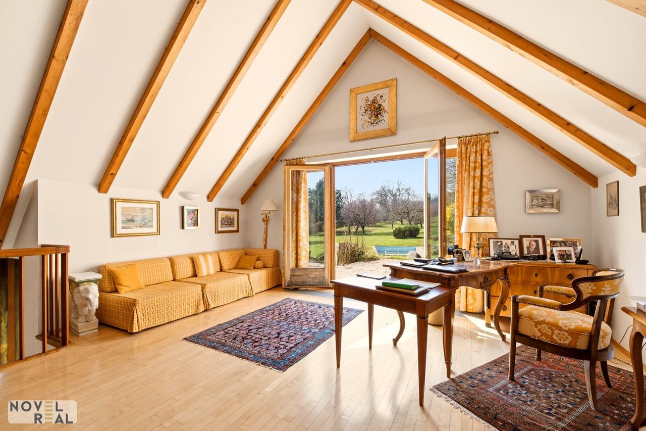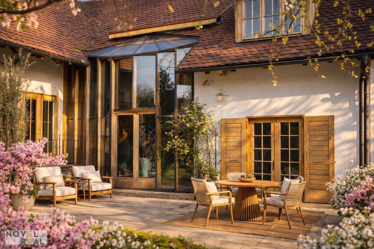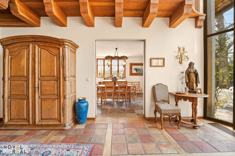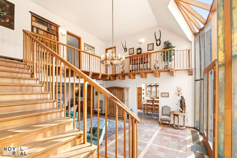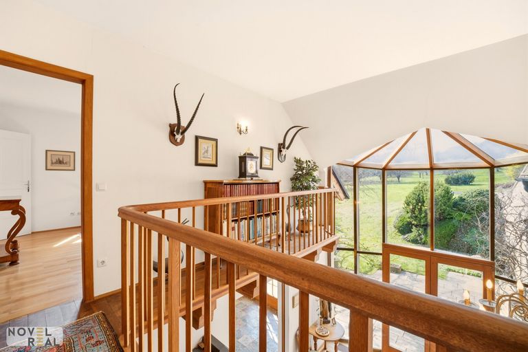 Das Haupthaus, 1994 mit größter Sorgfalt errichtet und harmonisch an den historischen Trakt angebunden, beeindruckt durch lichtdurchflutete Räume, raumhohe Fenster und eine offene, großzügige Architektur. Ein eleganter Salon mit Kamin, ein Wintergarten, eine sonnige Wohnküche mit offenem Kamin, private Rückzugsbereiche, ein Weinkeller, eine Sauna und ein ausbaubarer Dachboden schaffen ein Wohnambiente, das gleichermaßen repräsentativ wie behaglich ist.