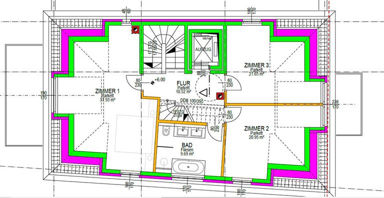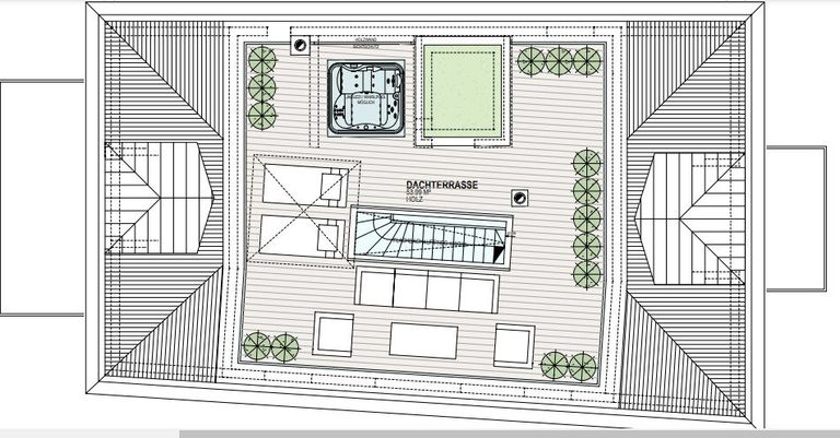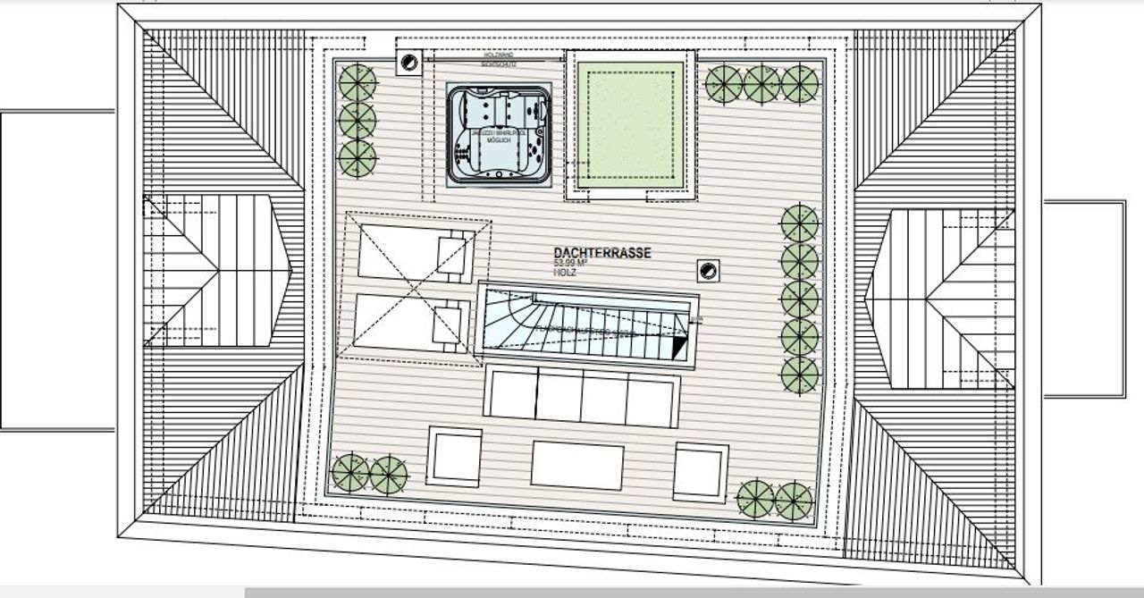 Im Dachgeschoss erwarten Sie drei weitere geräumige Zimmer. Das erste Zimmer hat eine Größe von 38 m², gefolgt von einem 22 m² großen Zimmer und einem 21 m² großen Zimmer. In der Mitte dieser Zimmer befindet sich ein großes Badezimmer mit einer Fläche von 10 m². Das Badezimmer ist bequem vom Flur aus zugänglich und bietet zusätzlichen Komfort und Privatsphäre. Über einen verglasten Flachdachaufstieg gelangt man auf eine 54,12 m² große Dachterrasse mit wunderschönem Weitblick.