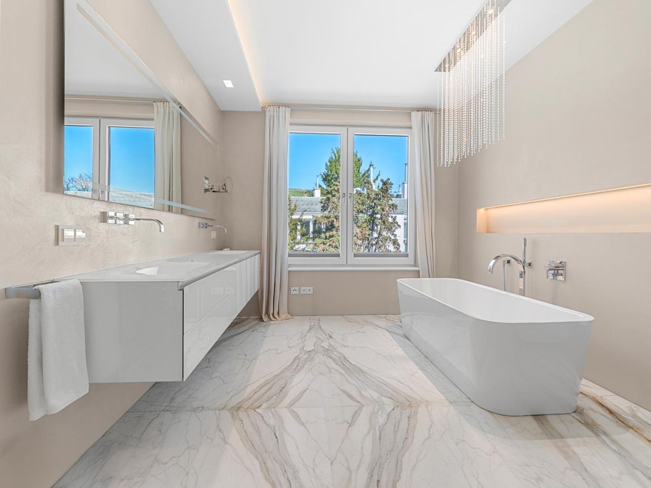 Dieses konsequent luxussanierte Eigenheim befindet sich in Bestlage des 19. Bezirks (Döbling). Der sehr großzügige Salon mit integriertem Essbereich und offenem Kamin bildet das Herzstück der Immobilie. Große Terrassenschiebetüren sorgen für viel Tageslicht und öffnen sich zum sonnigen, südseitigen Garten. Die separate Designküche von Valcucina verbindet moderne Ästhetik mit höchster Funktionalität. Vier großzügige Schlafzimmer mit Blick in den Garten bieten viel Raum für Rückzug und Entspannung. Die Liegenschaft verfügt über vier elegante Marmorbäder mit modernen Walk-In-Duschen und Badewannen. Hochwertige Garderoben-Einbauschränke von Poliform sowie ein separater Lagerraum bieten viel Stauraum.