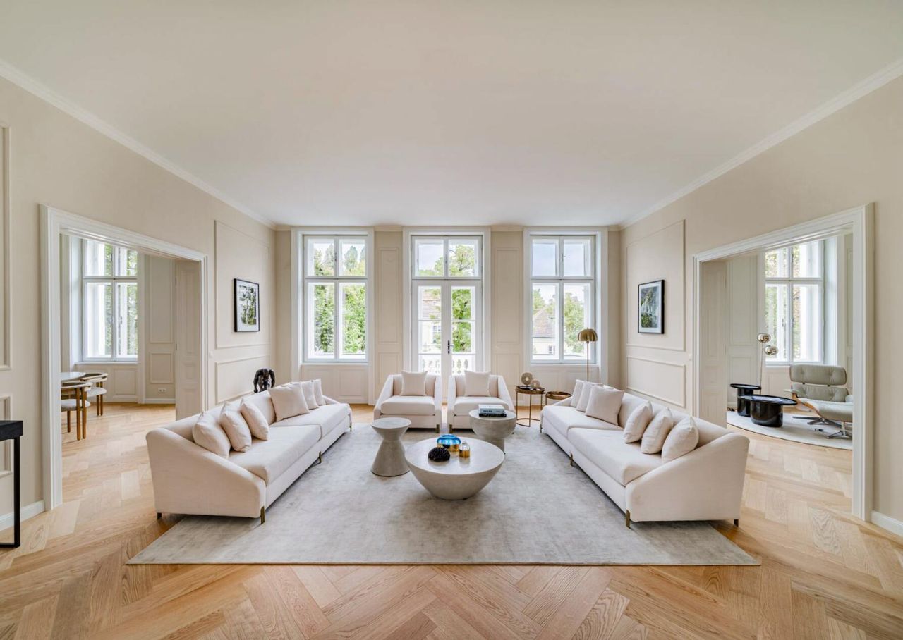 Man betritt das Palais über einen großzügigen Eingang, der direkt in eine repräsentatives und der Öffentlichkeit gewidmetes Erdgeschoß mündet. Von der Eingangshalle mit Garderobenbereich mündet eine Einliegerwohnung für Personal oder Gäste. Im rückwärtigen Geschoßteil eröffnet sich ein großzügiger Wohnsalon mit anschließender verborgener Küche und dahinterliegendem Hauswirtschaftsraum.