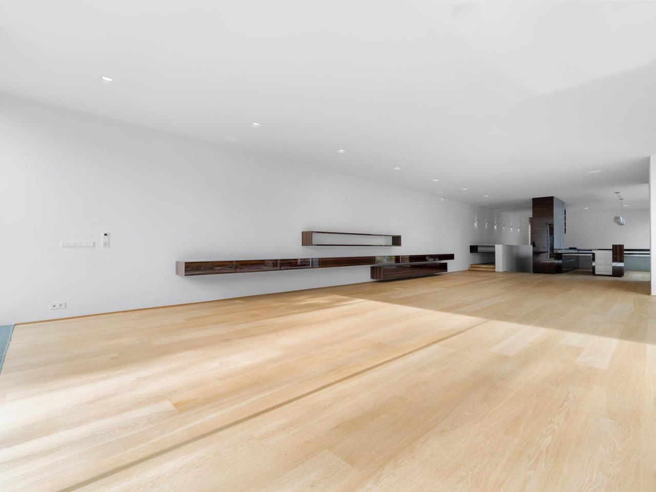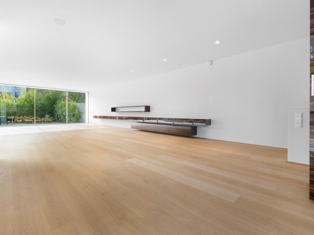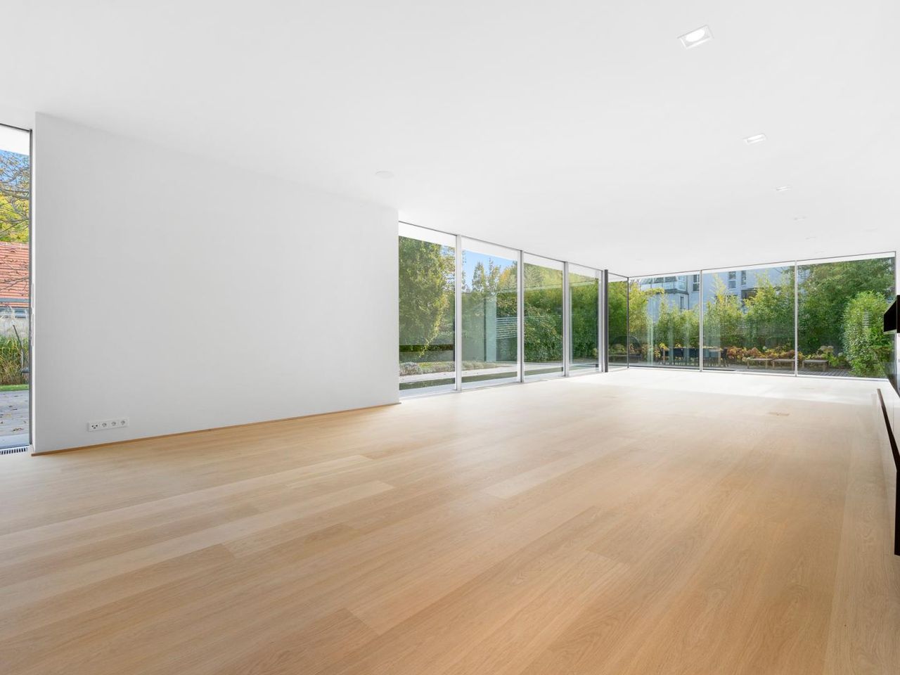 Über eine offene Treppe gelangen Sie in den rund 120 m² großen Wohn-, In- und Outdoor-Bereich, der sich zur Gartenlandschaft hin öffnet.