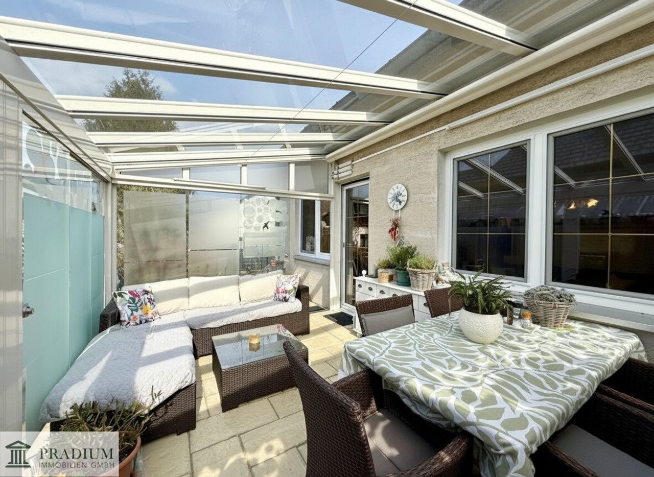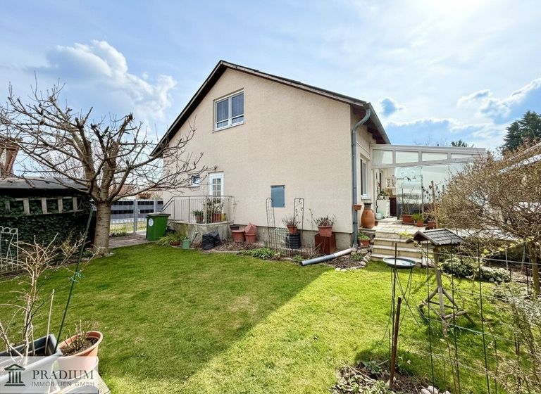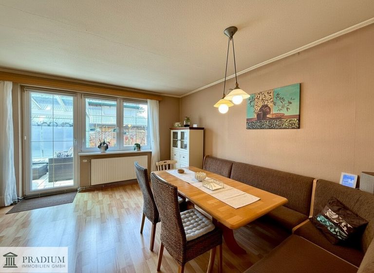 Besonders schön zeigt sich das Haus in der Verbindung von Innen- und Außenraum: Vom Wohnbereich aus gelangt man in den Terrassen- und Gartenbereich, der das Wohnen auf angenehme Weise erweitert. Ein Teil der Terrasse wurde verglast und wintergartenähnlich gestaltet, wodurch ein geschützter, lichtdurchfluteter Bereich entstanden ist, der sich hervorragend als gemütlicher Aufenthaltsplatz nutzen lässt – sei es für den Morgenkaffee, entspannte Stunden mit Blick ins Grüne oder als geschützter Übergang zwischen Haus und Garten.