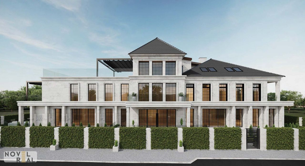 Diese exklusive Residenz besticht durch ihre zeitlos-klassische Architektur mit modernen Akzenten. Die stilvolle Fassadengestaltung wird durch symmetrisch angeordnete, bodentiefe Fenster mit feinen Sprossen stilvoll betont. Großzügige Fensterflächen durchfluten die Innenräume mit Tageslicht und schaffen eine warme, einladende Atmosphäre.