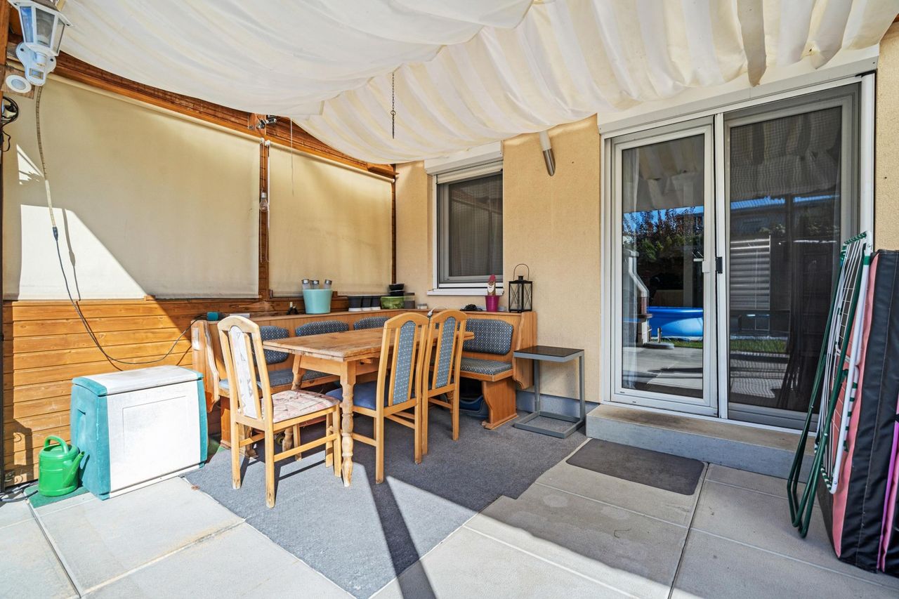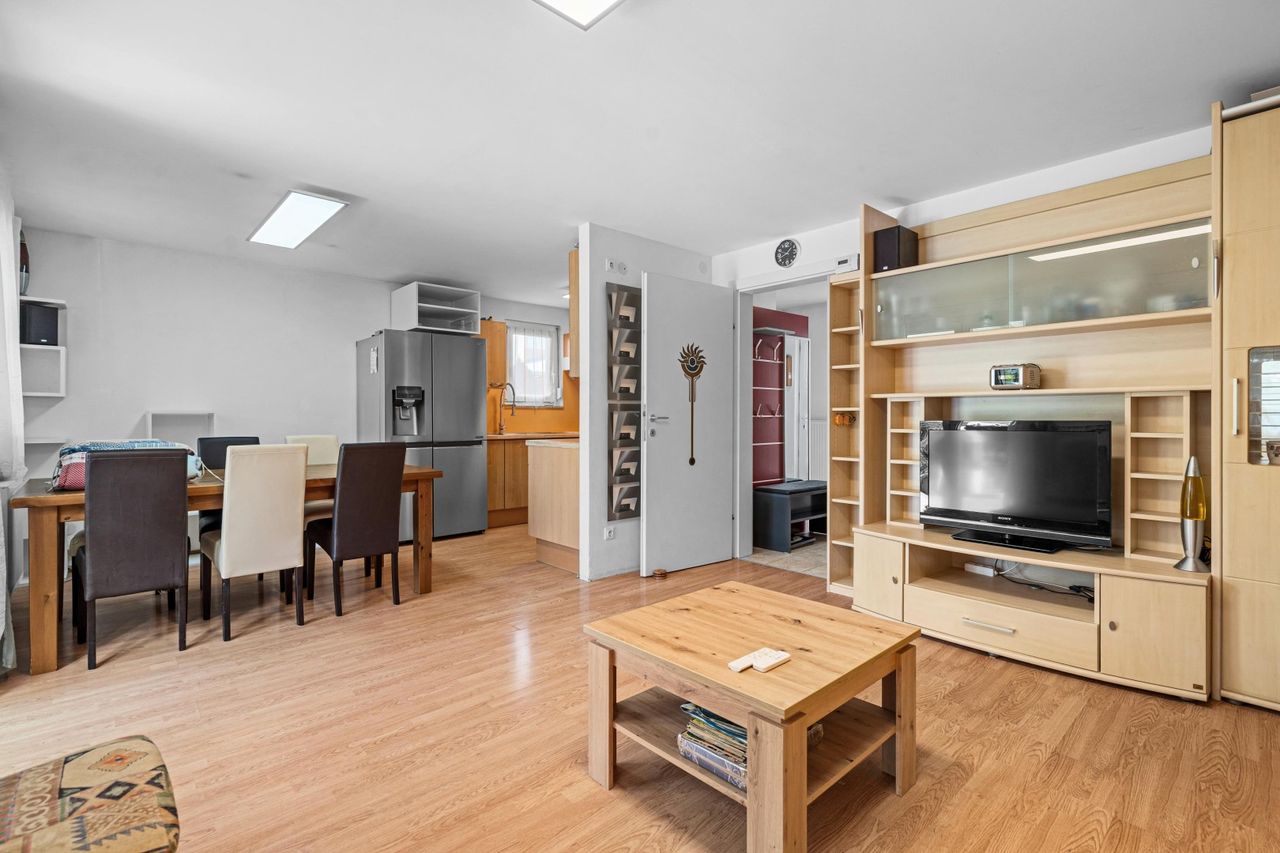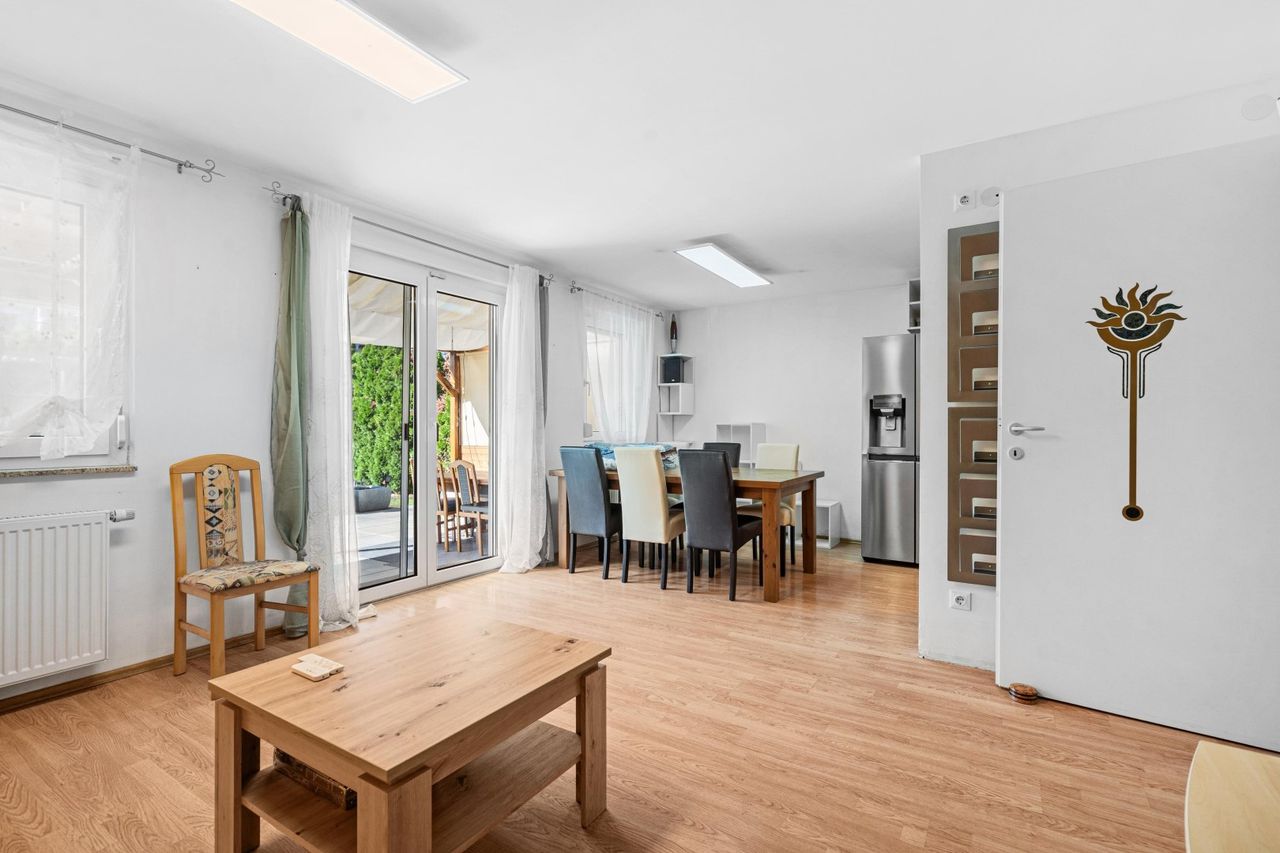 On the ground floor, you will find a bright, open living and dining area with direct access to the spacious, approx. 37.25 m² covered terrace. The kitchen is functional and well equipped. A WC is also available.