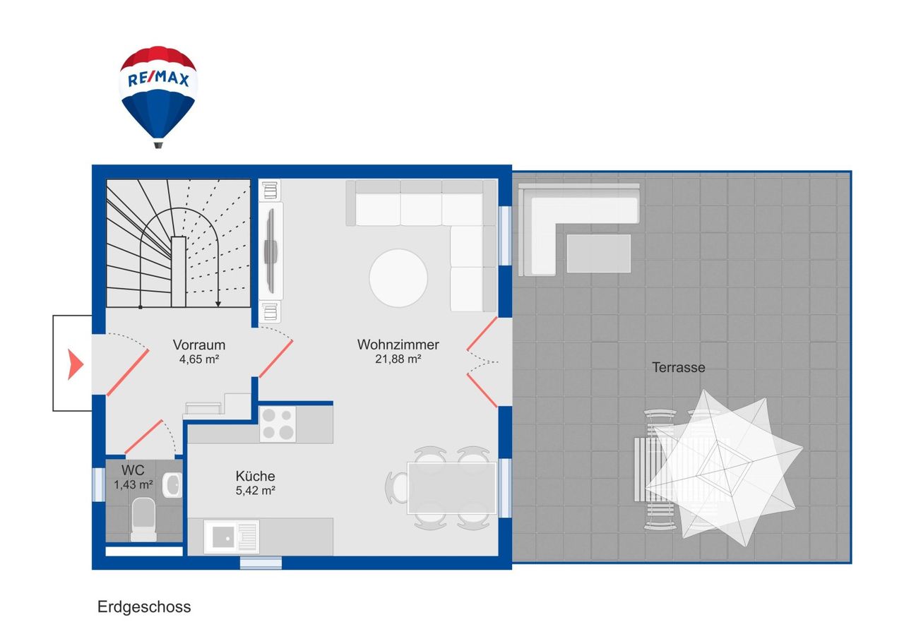Im Erdgeschoss erwartet Sie ein heller, offener Wohn- und Essbereich mit direktem Zugang zur großzügigen, ca. 37,25 m² großen überdachten Terrasse. Die Küche ist funktional und bestens ausgestattet. Ein WC ist ebenfalls vorhanden.