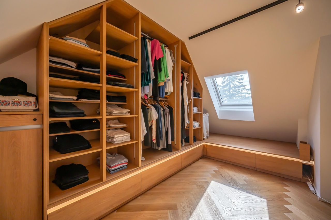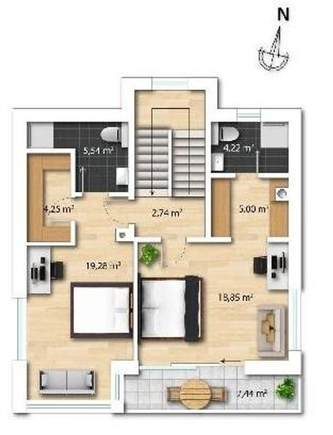 Dachgeschoss: 1 Zimmer, 1 Schrankraum, 1 Bad mit WC und einer Terrasse.