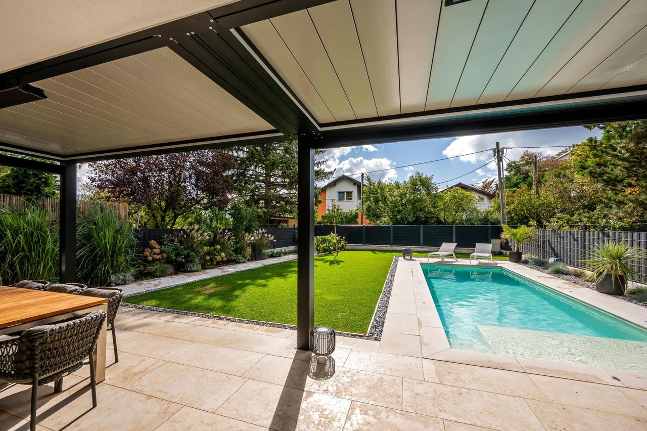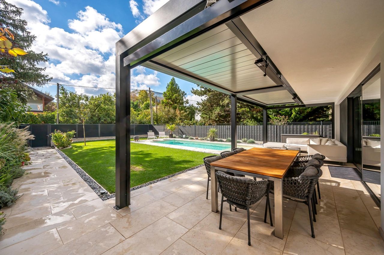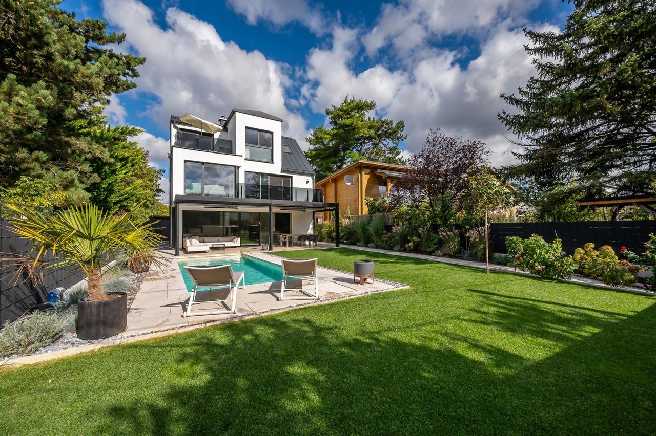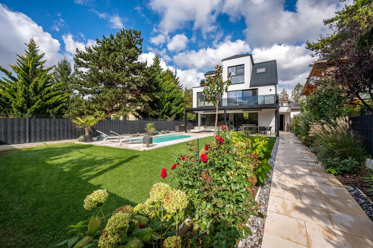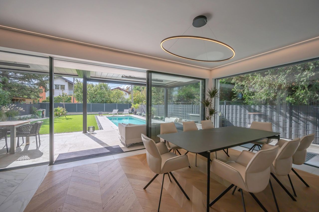 Dieses neuwertige, hochmoderne und volleingerichtete Einfamilienhaus (Villa) auf Eigengrund in zentral gelegener Ruhelage mit Garten, Terrassen, Swimmingpool und Fitnesscenter wurde 2023 fertiggestellt.