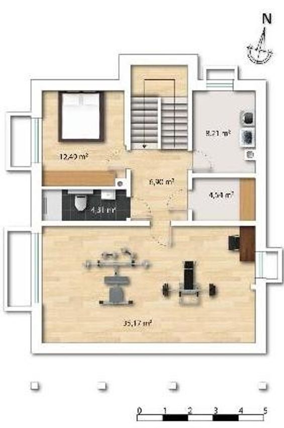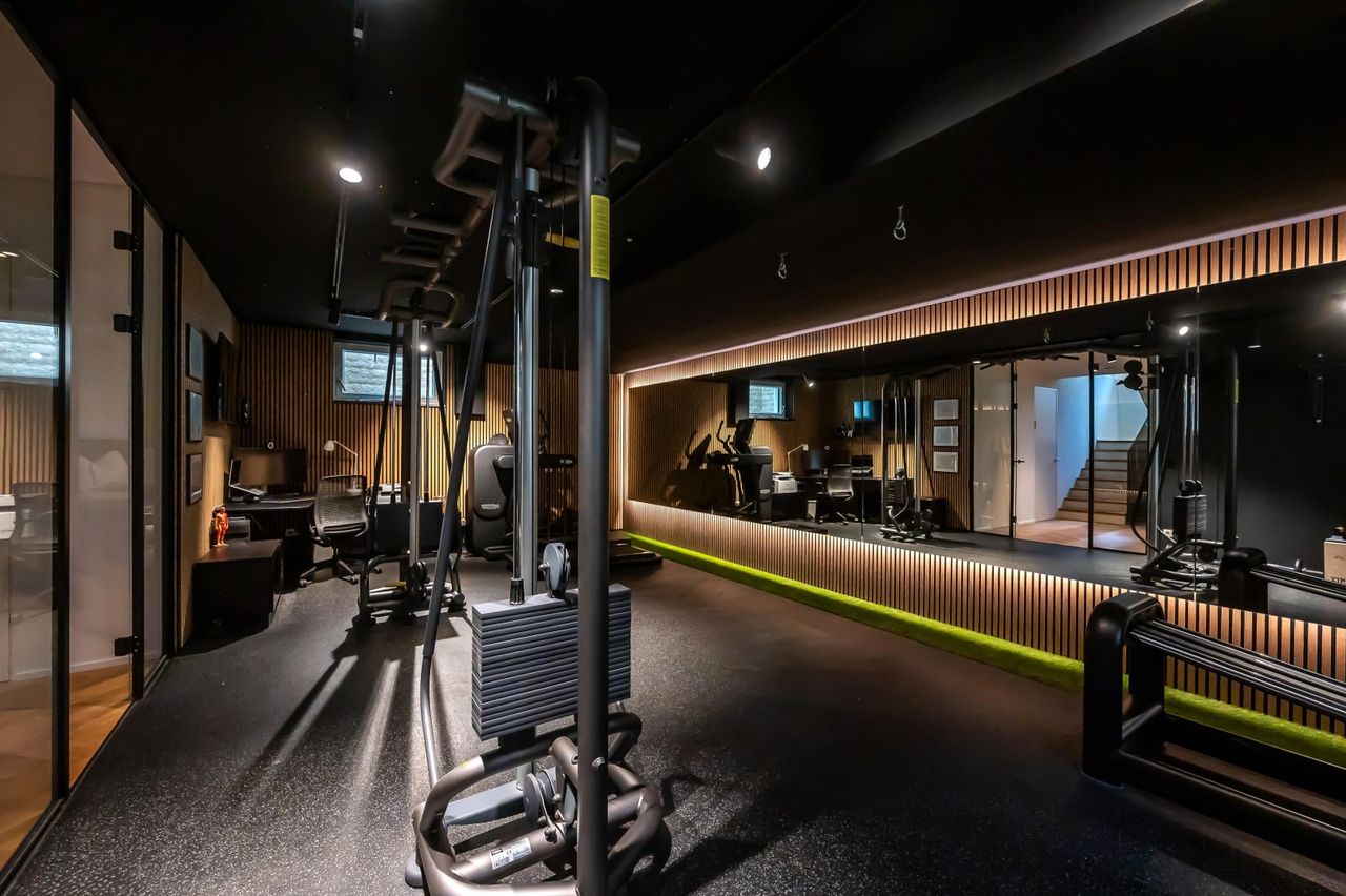 Untergeschoss: 1 Zimmer, 1 Waschküche/Technikraum, 1 Abstellraum, 1 Bad mit WC und ein großer Fitnessraum.