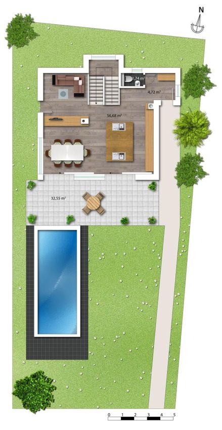 Gartengeschoss: Vorraum, Wohnraum, Wohnküche, Esszimmer, WC, Terrasse, Garten mit Swimmingpool.