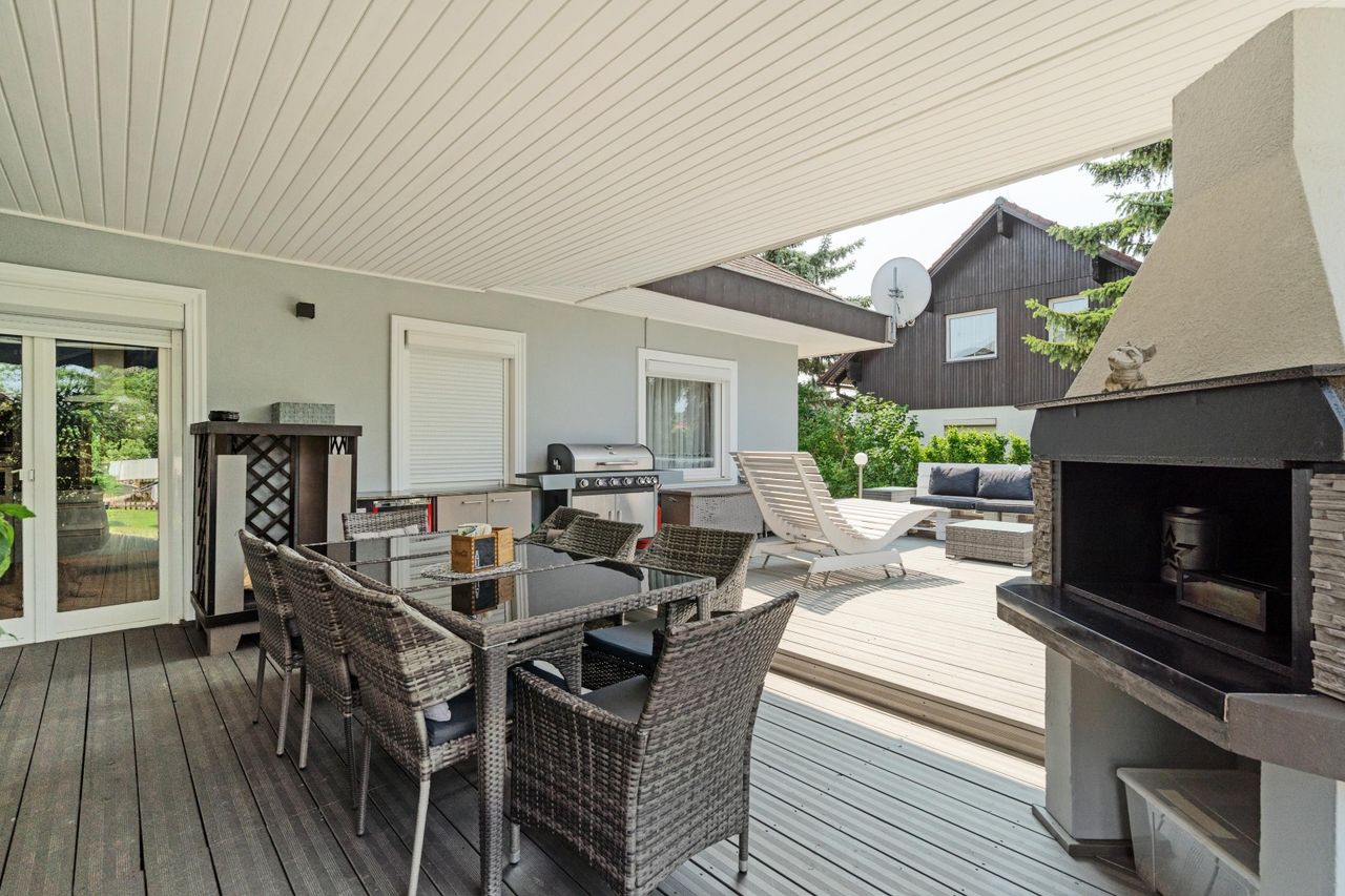 Über die großzügige Terrasse von ca. 60 m2 erreichen Sie den geschmackvoll gestalteten, westseitigen Wohlfühlgarten, der mit eigenem Hausbrunnen bewässert werden kann.