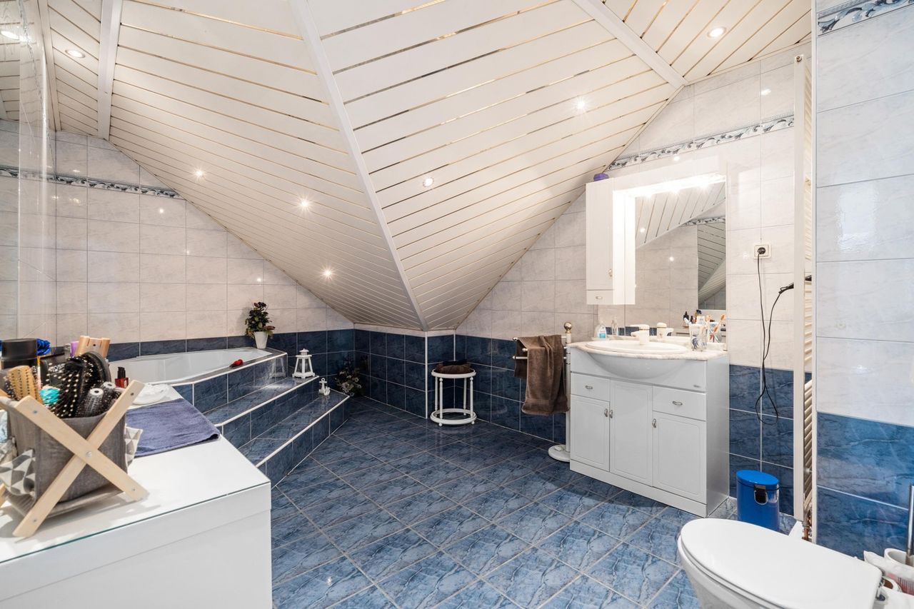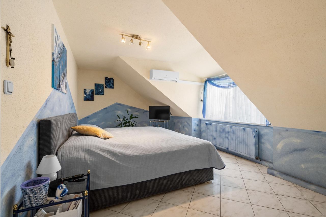 Fußbodenheizung, klimatisiertes Obergeschoß & ein klimatisiertes Zimmer im EG, zwei Bäder, zwei WC, Alarmanlage, Satellitenschüssel, Außenrollo im EG.