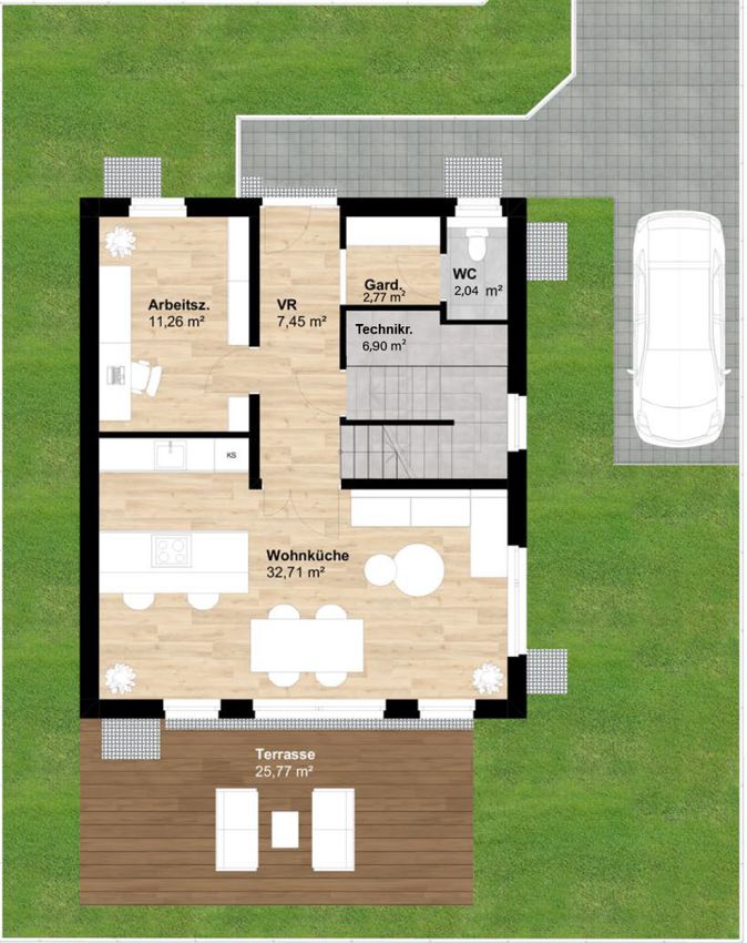Große Fensterflächen, helle Räume und eine klare Architektur sorgen für ein modernes Wohngefühl. Der eigene Garten erweitert den Wohnraum ins Freie und schafft zusätzlichen Lebensraum für Familie, Entspannung und Freizeit.