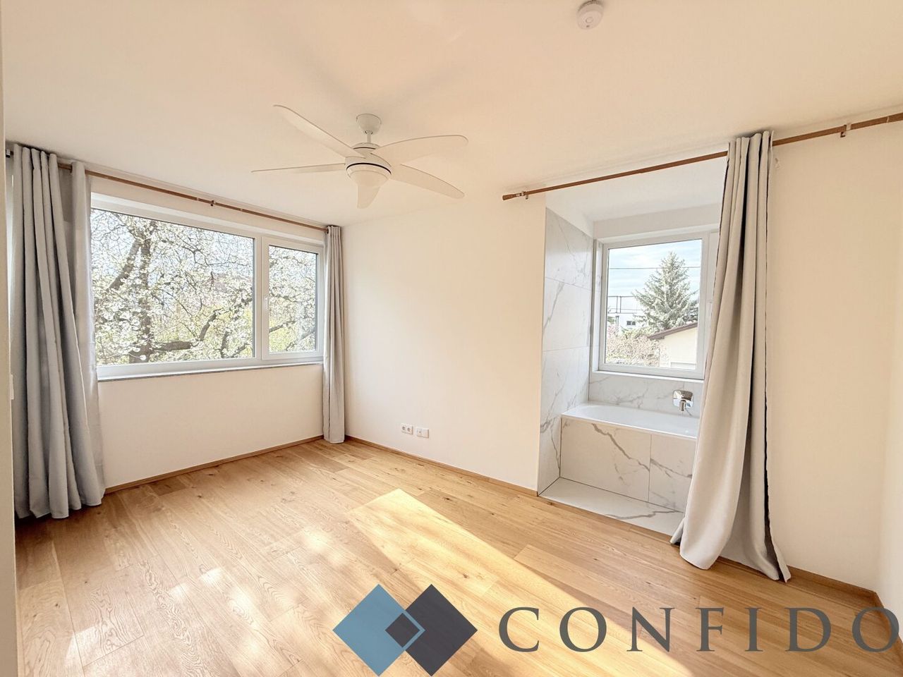 Im obersten Stockwerk befindet sich das Master Bedroom mit rund 20 m². Der vordere Bereich bietet Platz für einen möglichen Schrankraum. Ebenso verfügt diese Ebene über ein weiteres En-Suite-Bad mit bodengleicher Dusche und Toilette. Von hier aus gelangen Sie direkt auf die rund 18 m² große, östlich ausgerichtete Terrasse, die mit einem herrlichen Weit- und Grünblick begeistert.