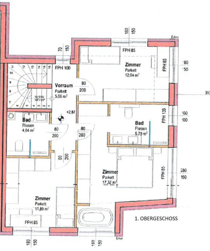 Über eine Stiege gelangt man in den ersten Stock des Hauses. Hier befinden sich drei separat begehbare Zimmer sowie zwei Badezimmer. Das Gästebad ist ca. 4 m² groß und mit einer bodengleichen Dusche sowie einer Toilette ausgestattet. Zwei der Zimmer verfügen jeweils über rund 12 m², das größte Zimmer misst knapp 17 m² und bietet ein En-Suite-Bad mit bodengleicher Dusche und Toilette. Zusätzlich steht ein weiterer Bereich mit integrierter Badewanne zur Verfügung.