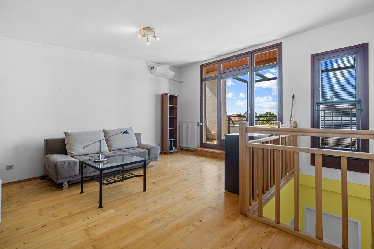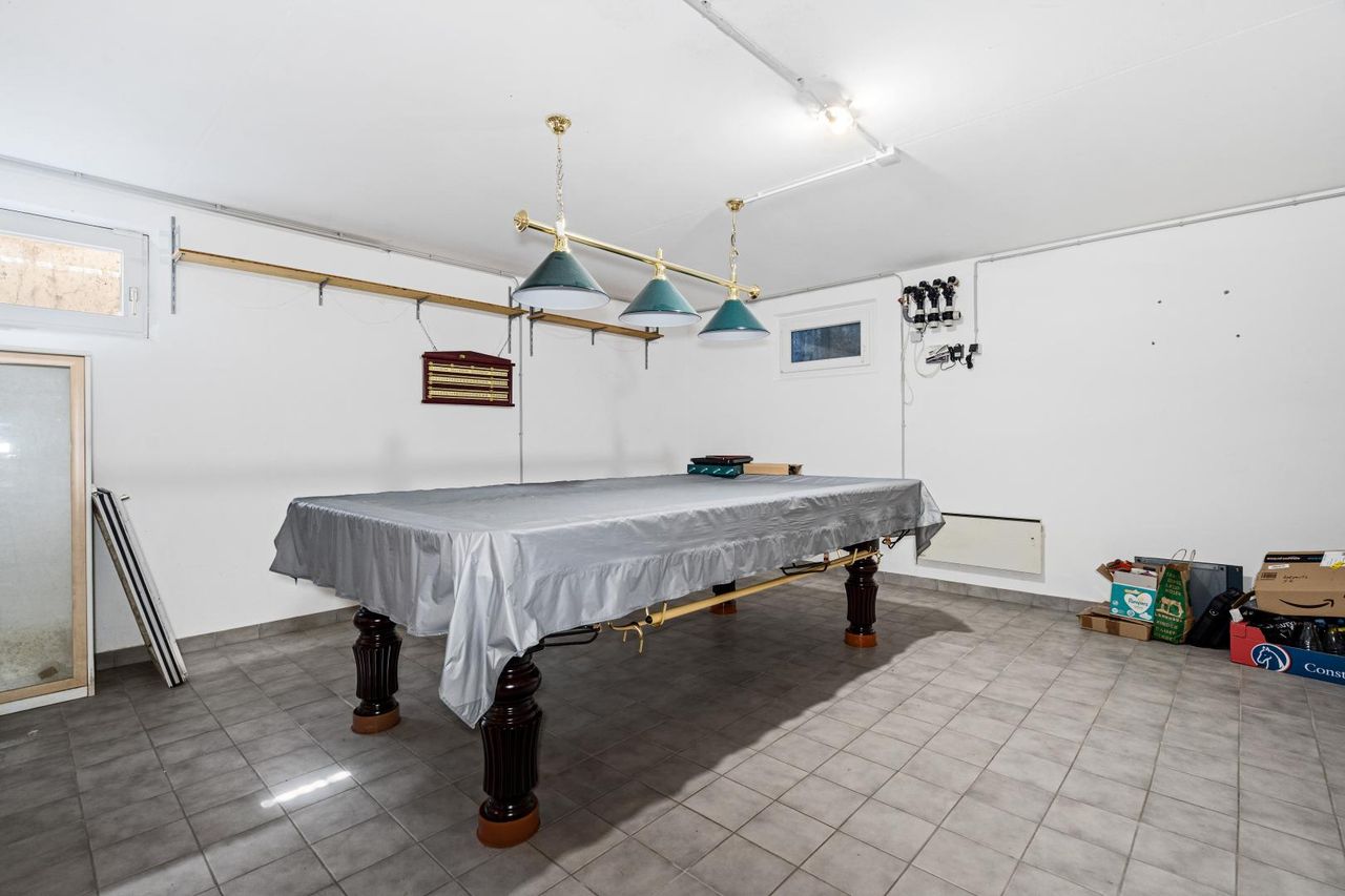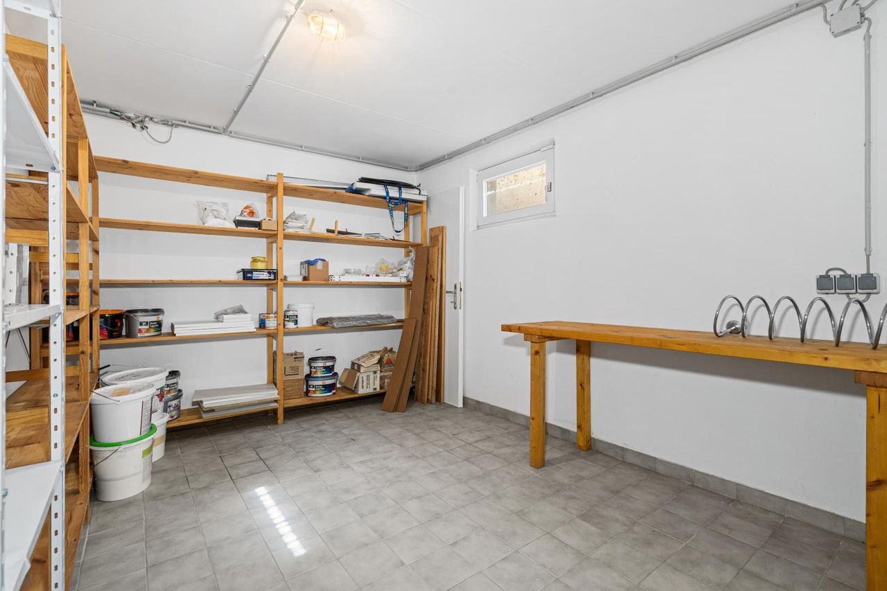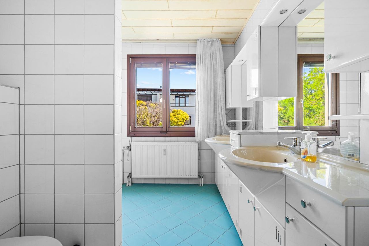 Ein besonderes Plus sind die großzügige Galerie mit Dachterrasse, der Keller mit Snooker-Tisch sowie der eigene Parkplatz (Miete € 56,–/Monat). Für angenehmes Raumklima sorgen Klimaanlagen auf jedem Stockwerk – im Wohnzimmer, in beiden Schlafzimmern sowie in der Galerie. Fernwärme und moderne Medienanschlüsse sind selbstverständlich vorhanden.