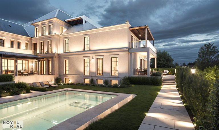 Die klare Linienführung und die harmonischen Proportionen verleihen dem Gebäude eine ruhige, repräsentative Ausstrahlung. Hochwertige Stilelemente wie zurückgesetzte Säulen, fein gearbeitete Gesimse und eine dezent integrierte Fassadenbeleuchtung unterstreichen den exklusiven Charakter dieser Immobilie – sowohl bei Tag als auch in stimmungsvoller Abendbeleuchtung.